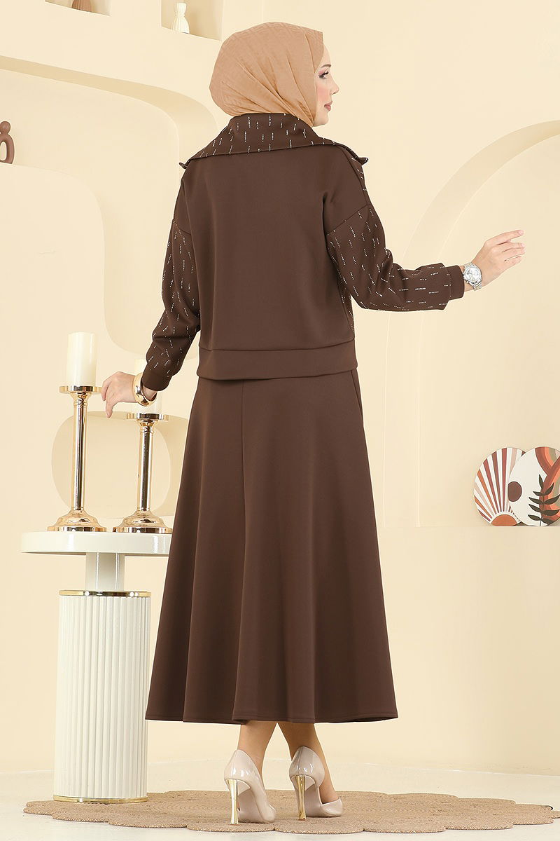 The Jeweled Scuba Skirt Set is specially designed for those who prefer modest clothing. This unique ensemble, which can be comfortably worn in all seasons, stands out with its feature of being washable at 30 degrees with delicate wash. Made from scuba fabric, this outfit features a stand-up collar and is unlined. The zipper on the front adds both elegance and practicality to the model. The stone details are adhesive and the waist of the skirt is designed with an elastic band for your comfort. The product displayed on the model is a size M and comes as a cardigan and skirt set.
