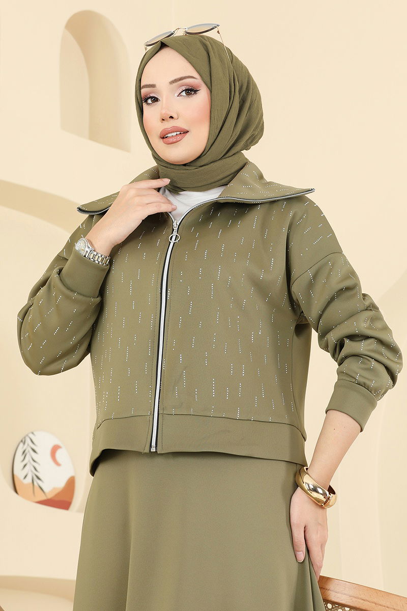The Jeweled Scuba Skirt Set is specially designed for those who prefer modest clothing. This unique ensemble, which can be comfortably worn in all seasons, stands out with its feature of being washable at 30 degrees with delicate wash. Made from scuba fabric, this outfit features a stand-up collar and is unlined. The zipper on the front adds both elegance and practicality to the model. The stone details are adhesive and the waist of the skirt is designed with an elastic band for your comfort. The product displayed on the model is a size M and comes as a cardigan and skirt set.