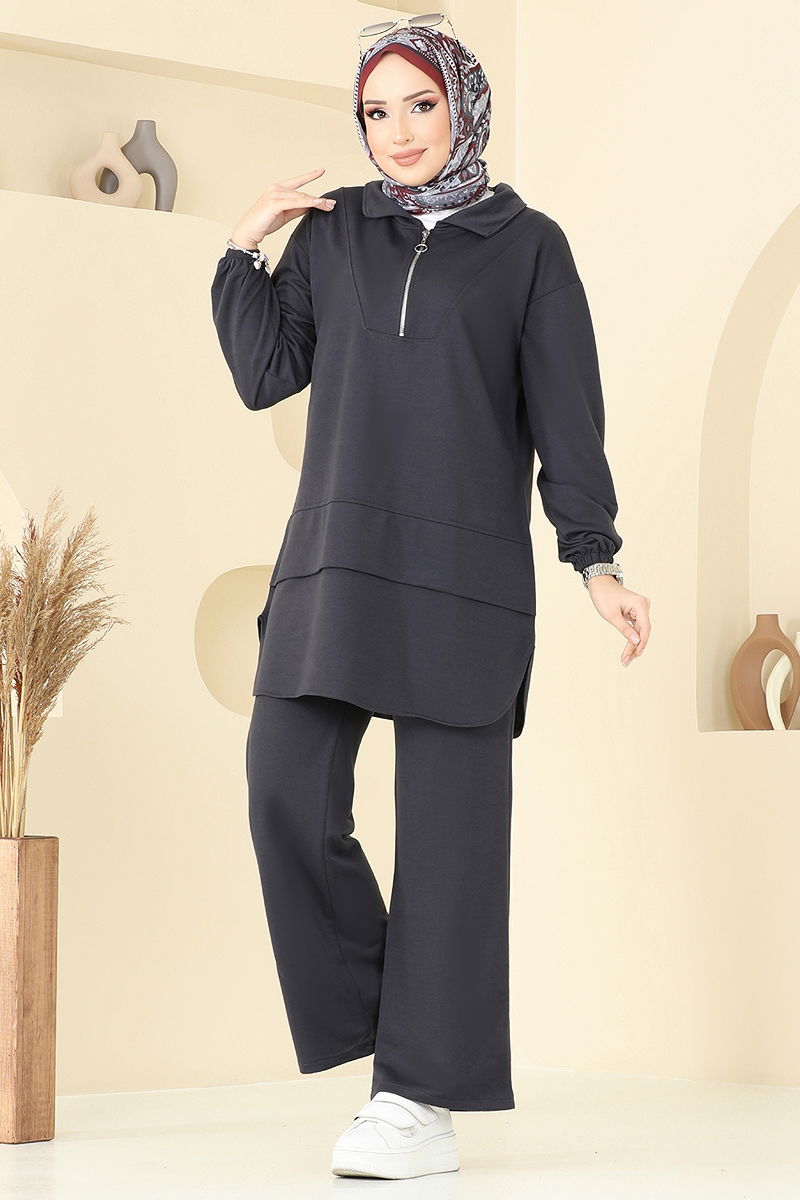 The Half-Zipper Dual Suit model is specially designed for modest wear, offering comfort across all seasons. It can be washed gently at 30 degrees, made from dual-thread fabric, and features a shirt collar for a modern and chic look. The tunic's side slit provides freedom of movement, while the pants’ elastic waist and cuffs offer all-day comfort. The zipper detail adds to its stylish functionality.