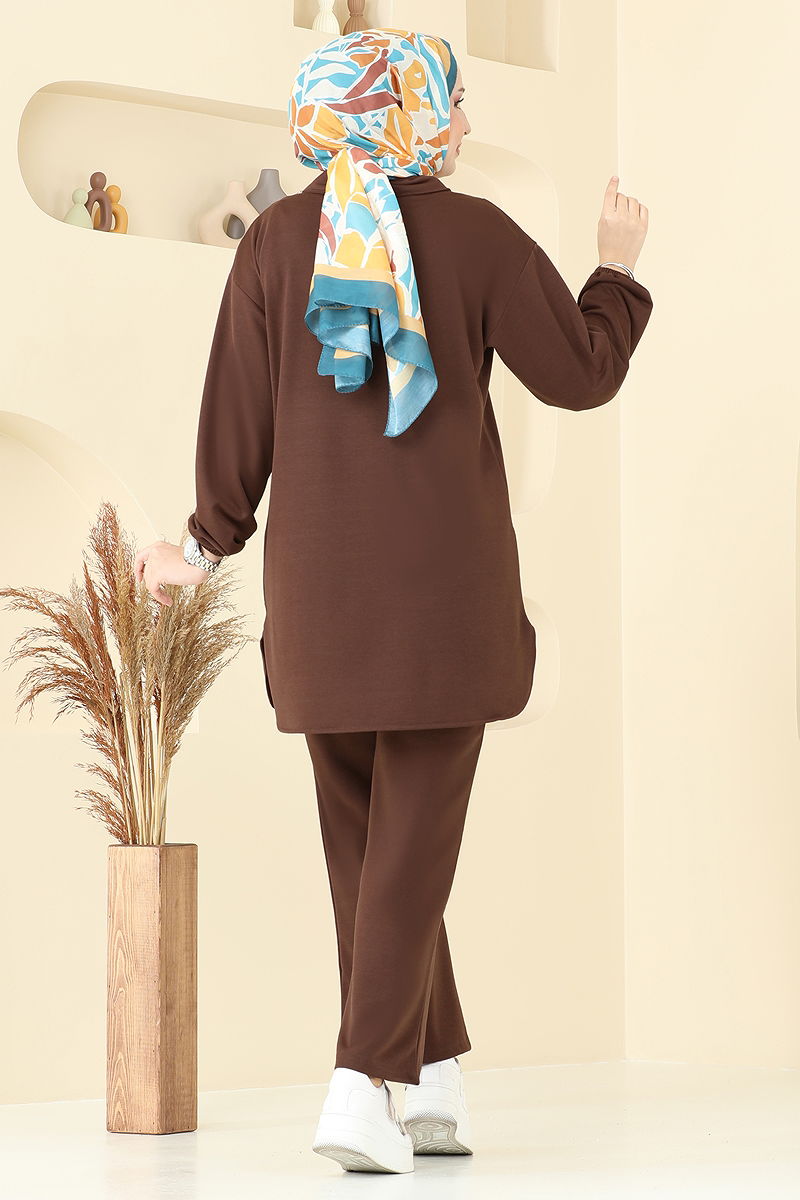 The Half-Zipper Dual Suit model is specially designed for modest wear, offering comfort across all seasons. It can be washed gently at 30 degrees, made from dual-thread fabric, and features a shirt collar for a modern and chic look. The tunic's side slit provides freedom of movement, while the pants’ elastic waist and cuffs offer all-day comfort. The zipper detail adds to its stylish functionality.