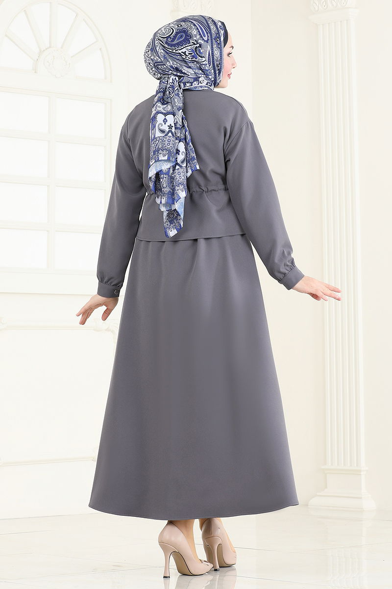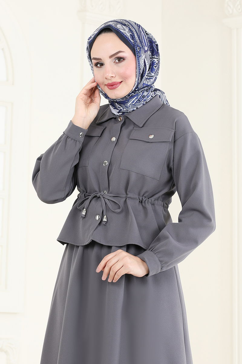The Drawstring Waist Hijab Outfit offers a modern and stylish combination that can be comfortably worn in any season. Made from durable Dabil fabric, it provides a comfortable wear experience. The shirt collar design and unlined structure enhance its lightness, while snap fasteners on the front allow for easy dressing. The elastic waistband in the skirt section ensures a comfortable fit. Active snaps on the chest and cuffs add both functional and aesthetic touches. Suitable for delicate garments, it can be cleaned with a gentle wash at 30°C.