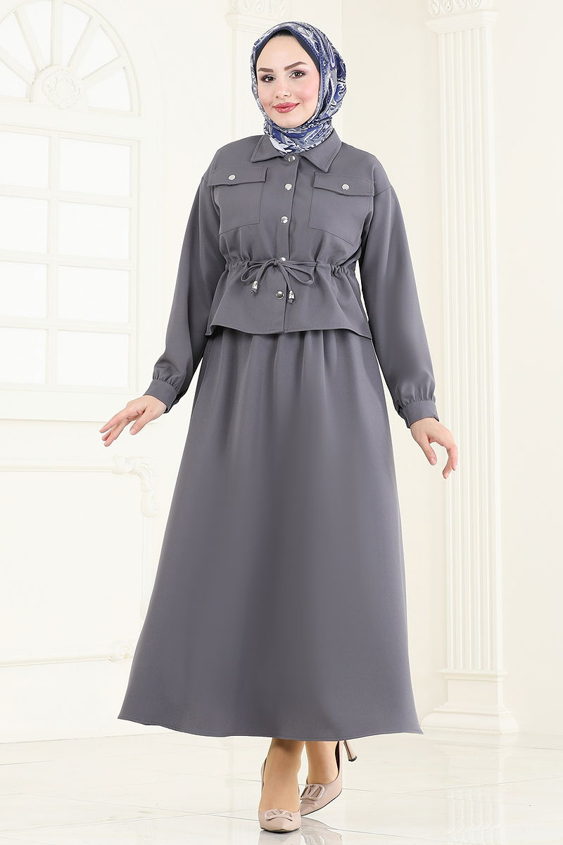 Product Feature : It is a new season hijab fashion product. There are snaps that can be used from the front. The product has a Shirt collar. Unlined. The product is lace-up. Blouse is not included. Sample combination is made with the blouse to show the intended use of the product. The chest pocket is active. The skirt waist is elastic. Cuff snaps are active. There may be a tonal difference in the product due to concept photo shoots.