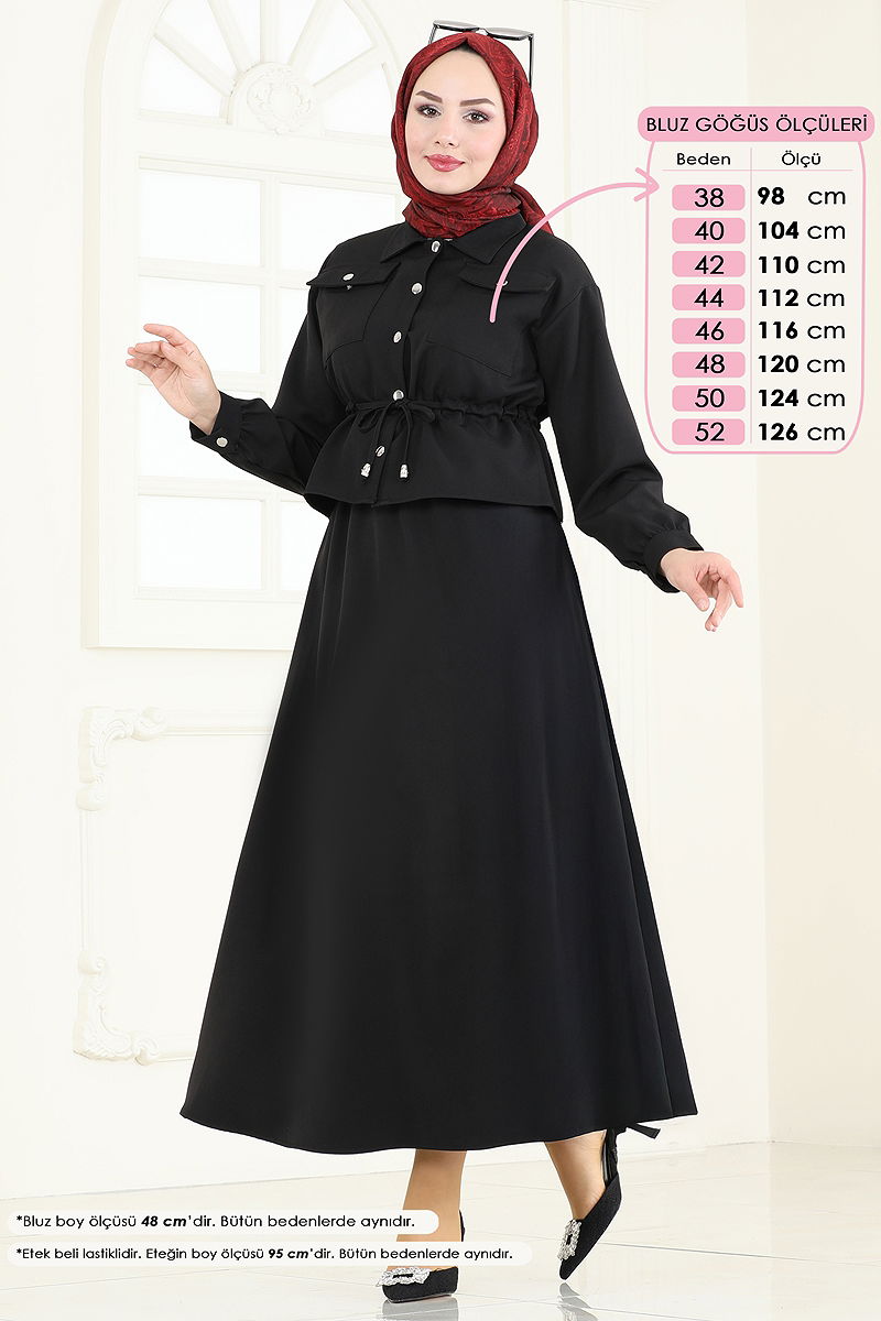 The Drawstring Waist Hijab Outfit offers a modern and stylish combination that can be comfortably worn in any season. Made from durable Dabil fabric, it provides a comfortable wear experience. The shirt collar design and unlined structure enhance its lightness, while snap fasteners on the front allow for easy dressing. The elastic waistband in the skirt section ensures a comfortable fit. Active snaps on the chest and cuffs add both functional and aesthetic touches. Suitable for delicate garments, it can be cleaned with a gentle wash at 30°C.