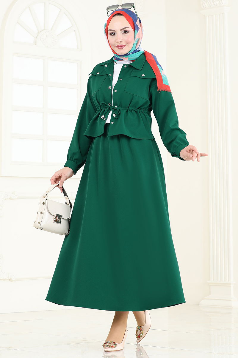 يحتوي على كبسات المنتج لديه ياقة القميص. غير مبطنة. المنتج بأربطة. البلوزة غير متضمنة. صُنعت عينة من المجموعة مع البلوزة لإظهار الاستخدام المقصود للمنتج. الجيب الصدري نشط. .خصر التنورة مرن كبسات الأكمام مفعلة قد يكون هناك اختلاف في الدرجة اللونية في المنتج بسبب التقاط الصور الفوتوغرافية.