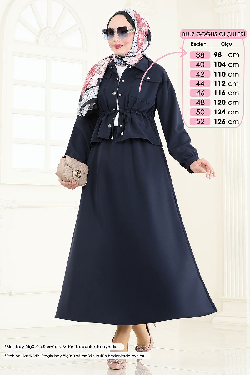 The Drawstring Waist Hijab Outfit offers a modern and stylish combination that can be comfortably worn in any season. Made from durable Dabil fabric, it provides a comfortable wear experience. The shirt collar design and unlined structure enhance its lightness, while snap fasteners on the front allow for easy dressing. The elastic waistband in the skirt section ensures a comfortable fit. Active snaps on the chest and cuffs add both functional and aesthetic touches. Suitable for delicate garments, it can be cleaned with a gentle wash at 30°C.