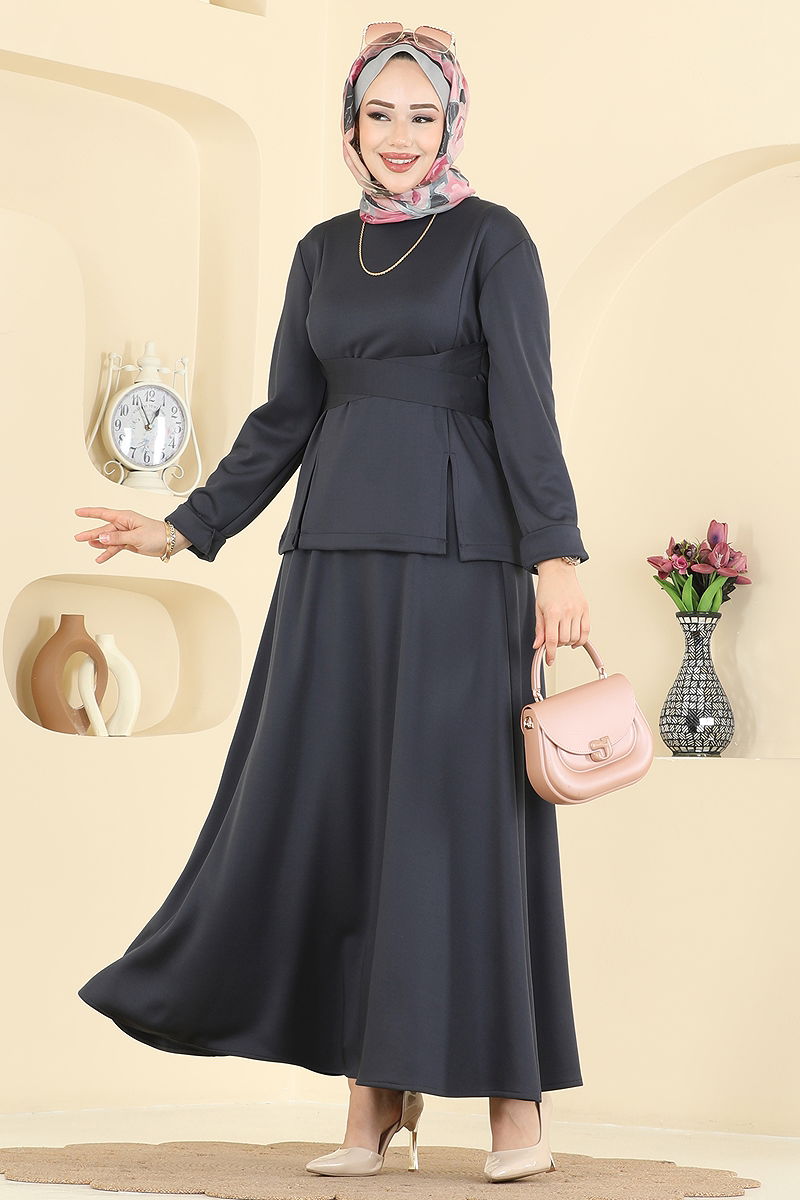 The Belted Scuba Set is a modest fashion ensemble designed for comfort in all seasons. This ensemble can be delicately washed at 30 degrees and features a bike neck design with a zippered back for a contemporary look. The tunic has a front slit for mobility and an attached belt for aesthetic unity. The skirt offers ease with its elastic waist. Ideal for those seeking a combination of style and comfort!