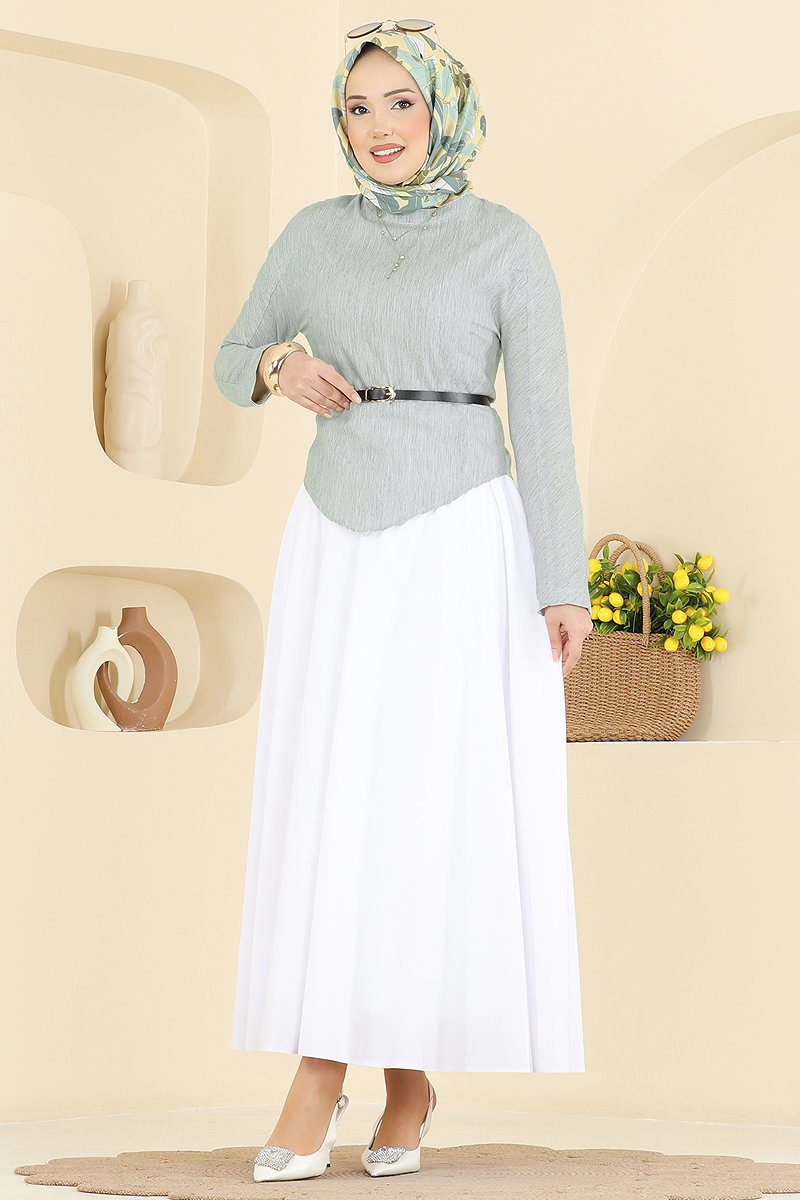 The Belted 2-Piece Skirt Set KOMBIN model combines modern elegance with modest fashion, making it a prime choice for all seasons. Crafted from linen and cotton fabrics suitable for gentle wash at 30 degrees, this outfit features a bicycle neck blouse and a lined skirt offering both comfort and style. It comes with a back zipper and a button for practicality. The waist of the skirt is elastic, and the belt included can be optionally removed. This chic and functional ensemble promises an elegant look for any setting.