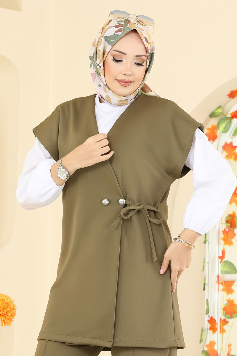 Elegant and comfortable, the Tie-Detail Scuba Suit is an ideal choice for those who embrace modern lines in modest fashion. This suit can be comfortably worn in all four seasons and is washable at 30 degrees on a gentle cycle. Made from flexible scuba fabric, it offers comfort all day long. The V-neck design adds an elegant touch, while its unlined structure keeps it lightweight. The product is designed with cape sleeves and comes in size M. Decorative buttons add a stylish accent, and the elastic waistband on the pants increases your comfort. Offered as a SET with VEST and PANTS, this suit will complete your chic appearance perfectly.