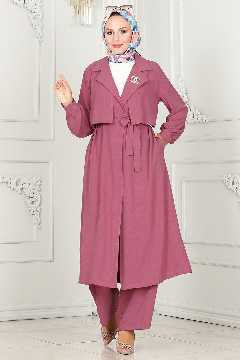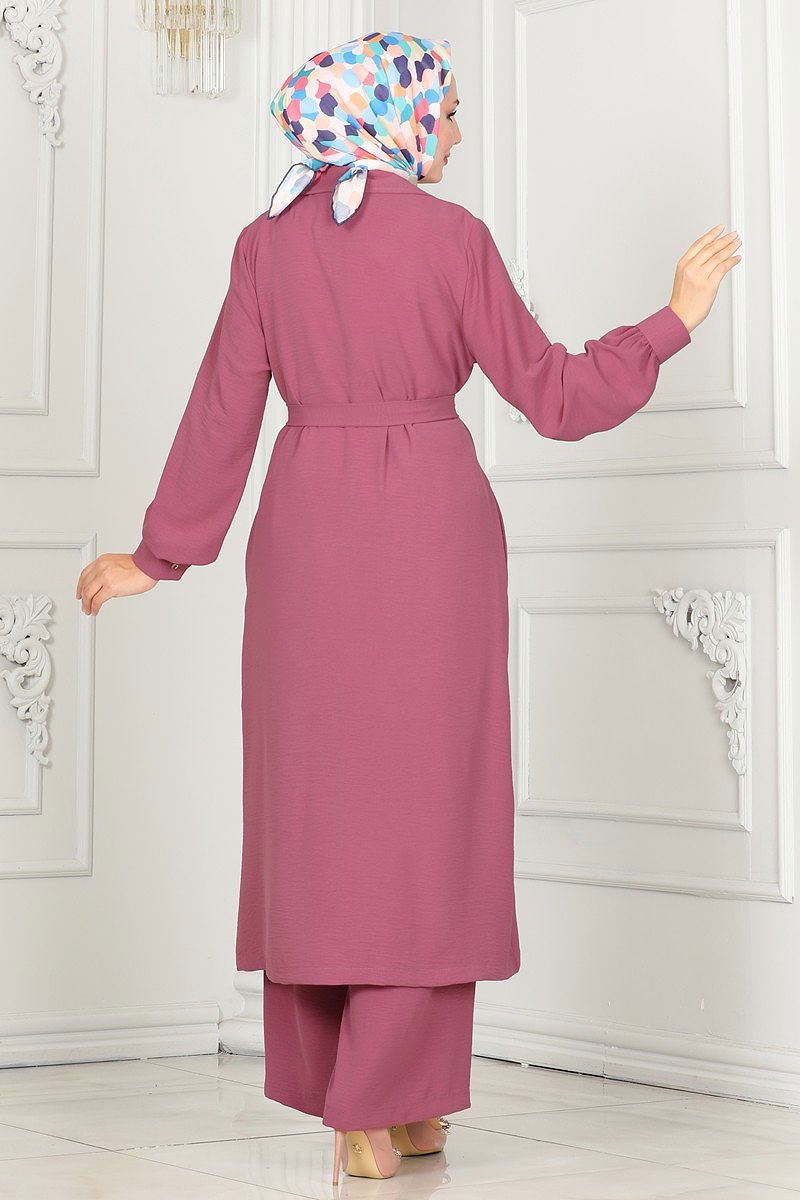المنتج لديه ياقة مفتوحة. غير مبطنة. الحزام متضمن، ،يمكن استخدامها حسب الرغبة البلوزة غير متضمنة. صُنعت عينة من المجموعة مع البلوزة لإظهار الاستخدام المقصود للمنتج. الملحقات غير متضمنة. يتميز البنطال بخصر وأساور مطاطية. أزرار الكفة نشطة. قد يكون هناك اختلاف في الدرجة اللونية في المنتج بسبب التقاط الصور الفوتوغرافية.