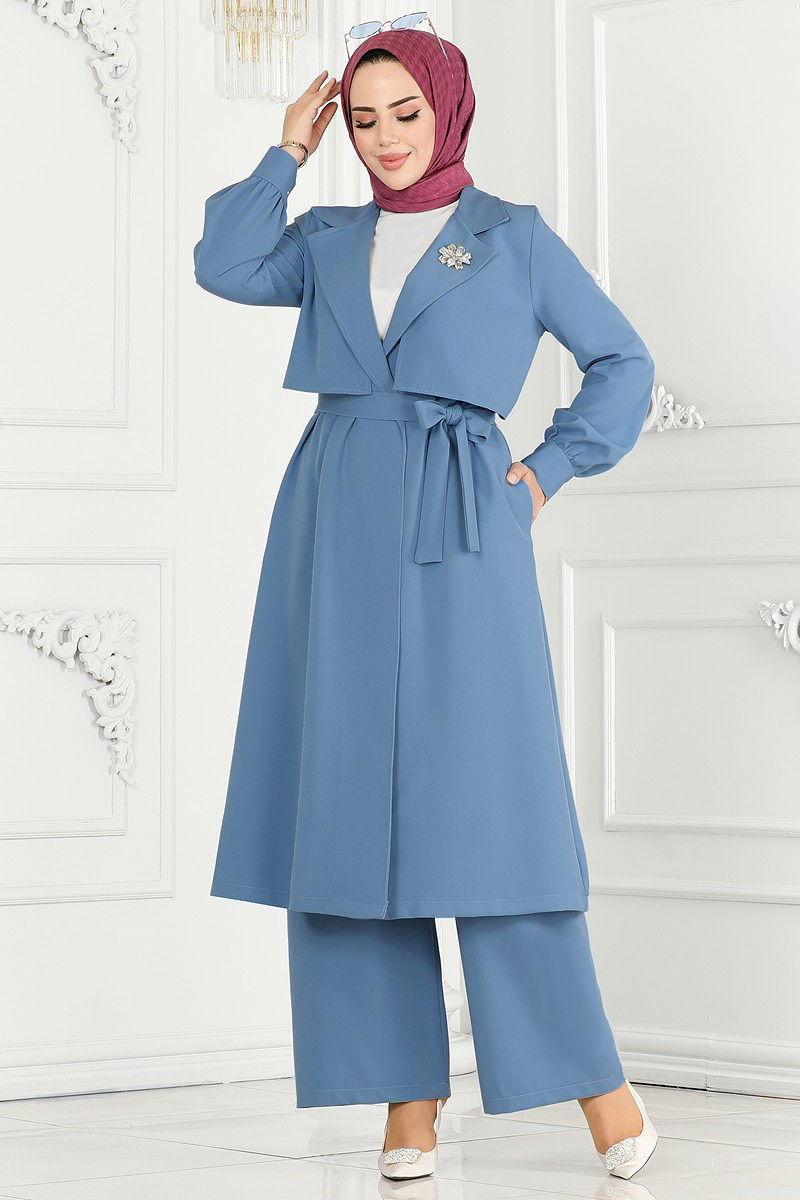 Product Feature : It is a new season hijab fashion product. The product has a Double-breasted collar. Unlined.. Belt included, optional not available. Accessories are not included. Pocket available. The waist of the trousers is elastic. Cuff buttons are active. There may be a tonal difference in the product due to concept photo shoots.