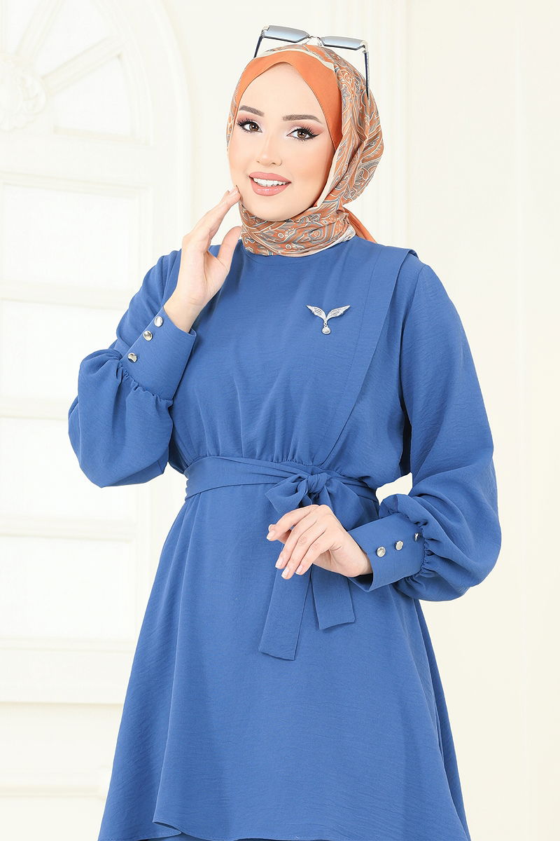 The Belted Aerobin Hijab Suit is a comfortable and stylish choice, suitable for all seasons. Washable at 30 degrees on a gentle cycle, this product is made from aerobin fabric and is durable. It features a semi-mandarin collar and a lining-free design for a contemporary look. The elastic waist on the pants ensures ease of wear, while cuff buttons on the tunic add a chic detail. The belt is integrated with the outfit but can be optionally removed.