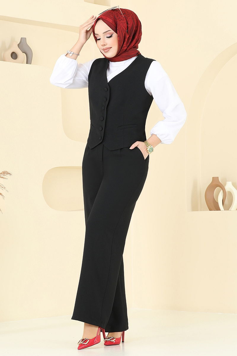 المنتج لديه ياقة مفتوحة. المنتج به أزرار من الأمام. السترة مبطنة.. السترة الداخلية بلا أكمام. البلوزة غير متضمنة. صُنعت عينة من المجموعة مع البلوزة لإظهار الاستخدام المقصود للمنتج. الملحقات غير متضمنة. توجد بطانة للكتفين. يتميز البنطال بسحّاب للإغلاق من الأمام. قد يكون هناك اختلاف في الدرجة اللونية في المنتج بسبب التقاط الصور الفوتوغرافية.