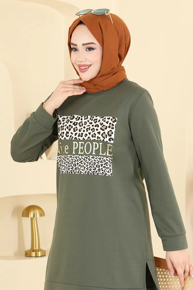 Product Feature : It is a new season hijab fashion product. The product has a Cycling collar. The tunic has a side slash.. Unlined. The writings are in print. Pattern details are printed. The waist of the trousers is elastic. There may be a tonal difference in the product due to concept photo shoots.