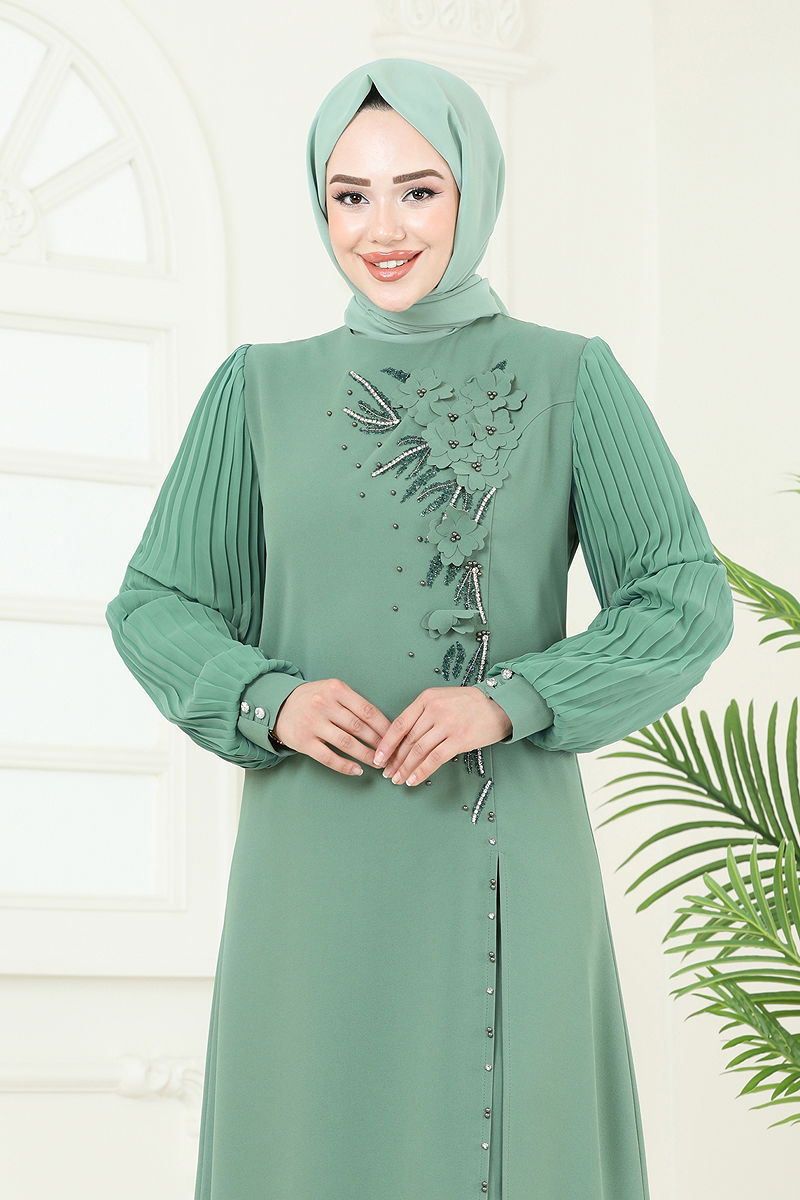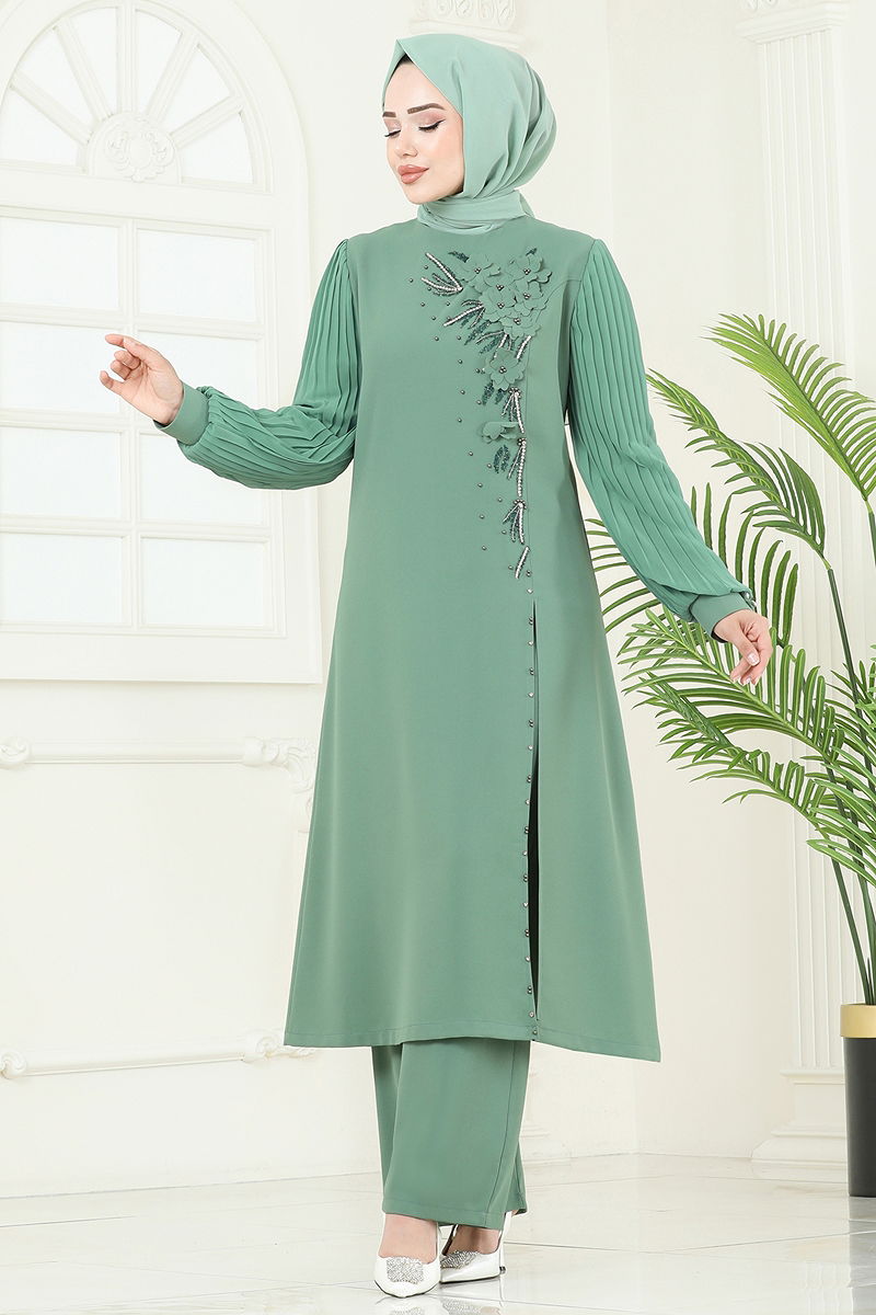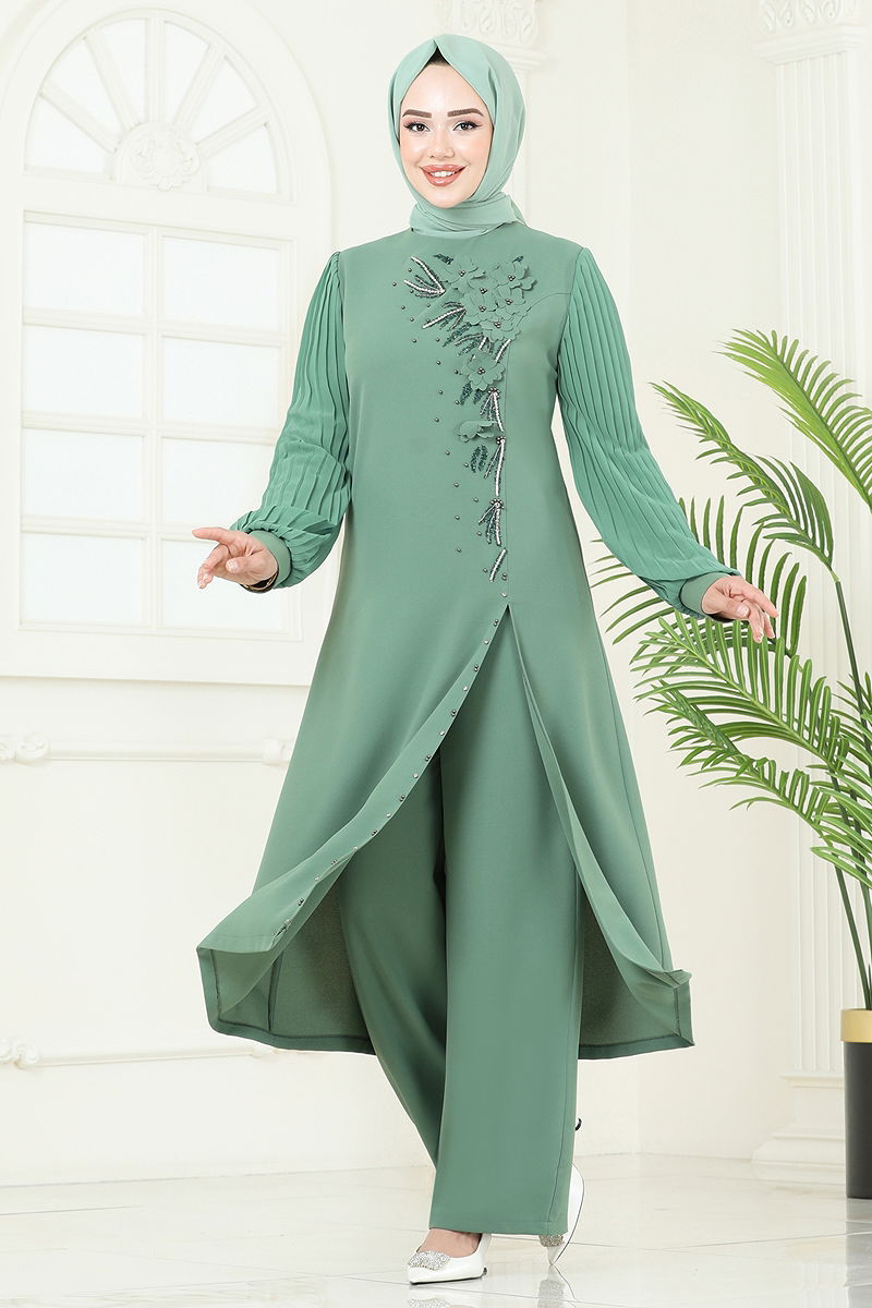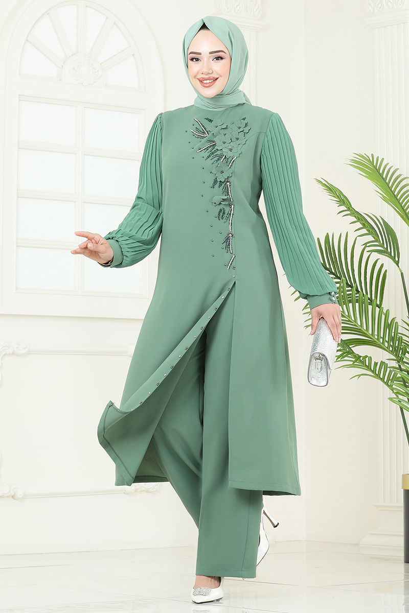 Product Feature : It is a new season hijab fashion product. The product has a Cycling collar. The tunic has a side slash.. Unlined. The product has a zipper at the from the back part. Bead details are my pocket knife. The stones are glued. The waist of the trousers is elastic. Cuff buttons are active. There may be a tonal difference in the product due to concept photo shoots.