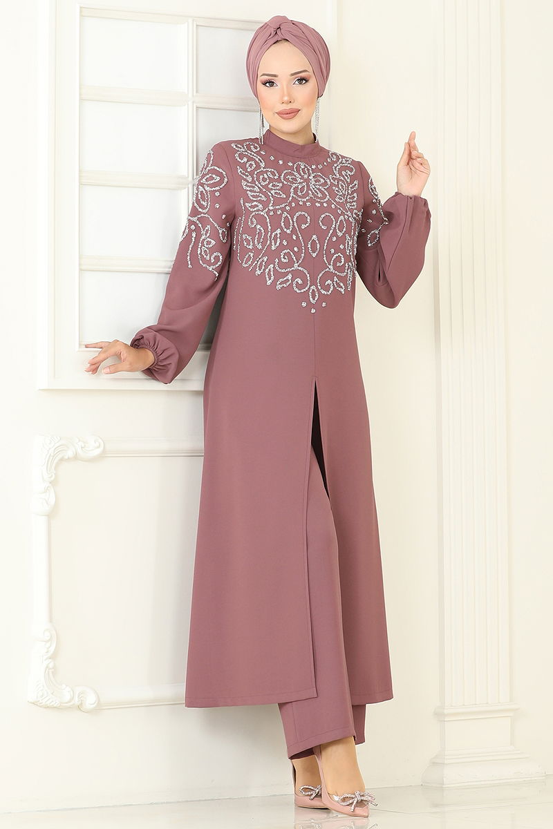 المنتج لديه ياقة نصف بيضوية. البلوز تحتوي على فتحة. غير مبطنة. المنتج به سحاب في جزء من الخلف. يتم لصق الحجارة. خصر البنطال مرن. السوار مطاطي. قد يكون هناك اختلاف في الدرجة اللونية في المنتج بسبب التقاط الصور الفوتوغرافية.