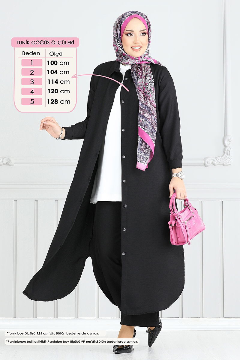 The Front Buttoned Linen Suit combines elegance and comfort in modest fashion with its model. It can be comfortably used in all four seasons. Made from Sofia linen fabric, it offers a light and breathable structure. Designed for delicate washing, it can be washed at 30 degrees. With shirt collar and front button details, it presents a modern look, while the side-slit tunic design provides freedom of movement. Its unlined design offers a natural usage experience. The elastic waist of the tunic and pants ensures comfort throughout the day. Active cuff buttons allow you to personalize your style.
