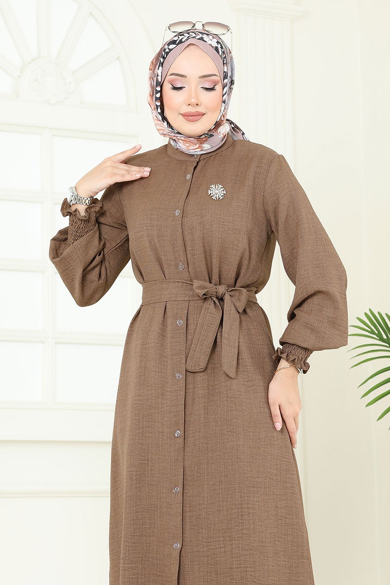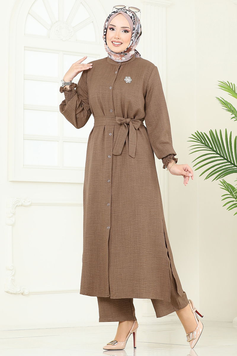 Product Feature : It is a new season hijab fashion product. The product has a Judge collar. The product has From the front buttons. The tunic has a side slash.. Unlined. Belt included, optional not available. Blouse is not included. Sample combination is made with the blouse to show the intended use of the product. Accessories are not included. The waist of the trousers is elastic. The cuff is rubberized. There may be a tonal difference in the product due to concept photo shoots.