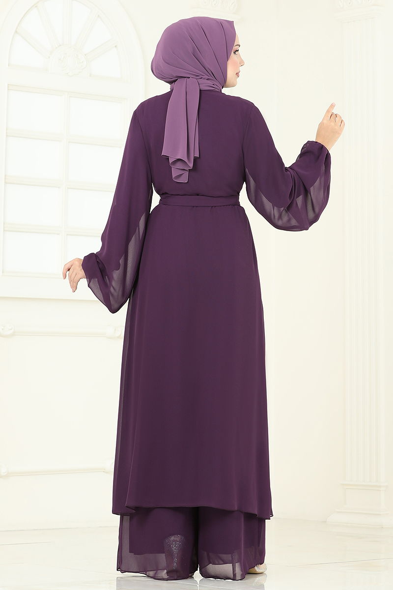 The Lace Detailed Chiffon Suit, specially designed for modest wear, offers a striking elegance. This suit, which can be comfortably worn in all four seasons, can be cleaned at 30 degrees with delicate washing. Made from chiffon fabric, trouser this lined product provides a perfect fit to the body. Displayed in size 40, the lace details are sewn, while the stones are printed. The trousers' elastic waist and cuffs ensure comfort throughout the day. Comprising of a TOP and TROUSERS, this two-piece suit is ideal for those seeking both style and comfort.