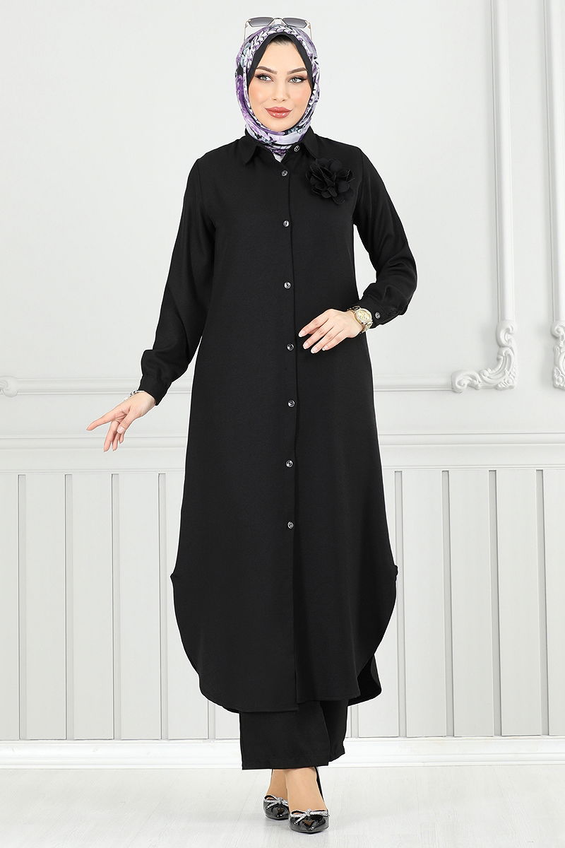 Product Feature : It is a new season hijab fashion product. The product has a Shirt collar. The product has From the front buttons. The tunic has a side slash.. Unlined. Brooch included, optional not available. Blouse is not included. Sample combination is made with the blouse to show the intended use of the product. The waist of the trousers is elastic. Cuff buttons are active. There may be a tonal difference in the product due to concept photo shoots.