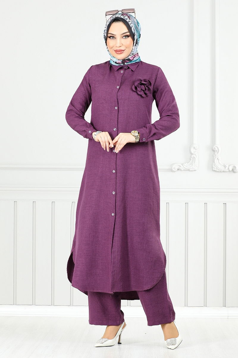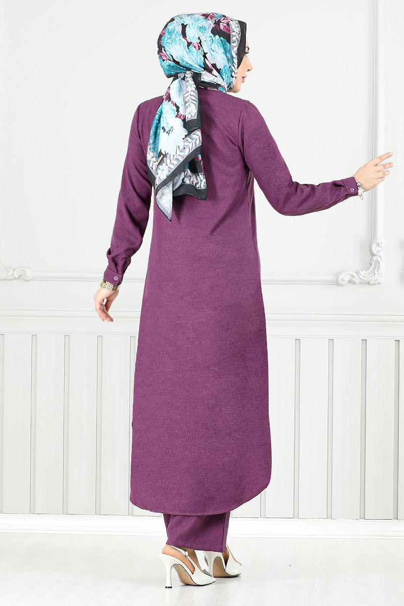 Product Feature : It is a new season hijab fashion product. The product has a Shirt collar. The product has From the front buttons. The tunic has a side slash.. Unlined. Brooch included, optional not available. The waist of the trousers is elastic. Cuff buttons are active. There may be a tonal difference in the product due to concept photo shoots.