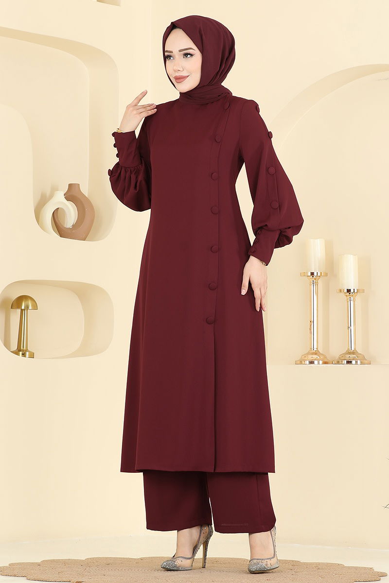 Product Feature : It is a new season hijab fashion product. The product has a Cycling collar. Unlined. The product has a zipper at the from the back part. Buttons are accessories. The waist of the trousers is elastic. Cuff buttons are active. There may be a tonal difference in the product due to concept photo shoots.