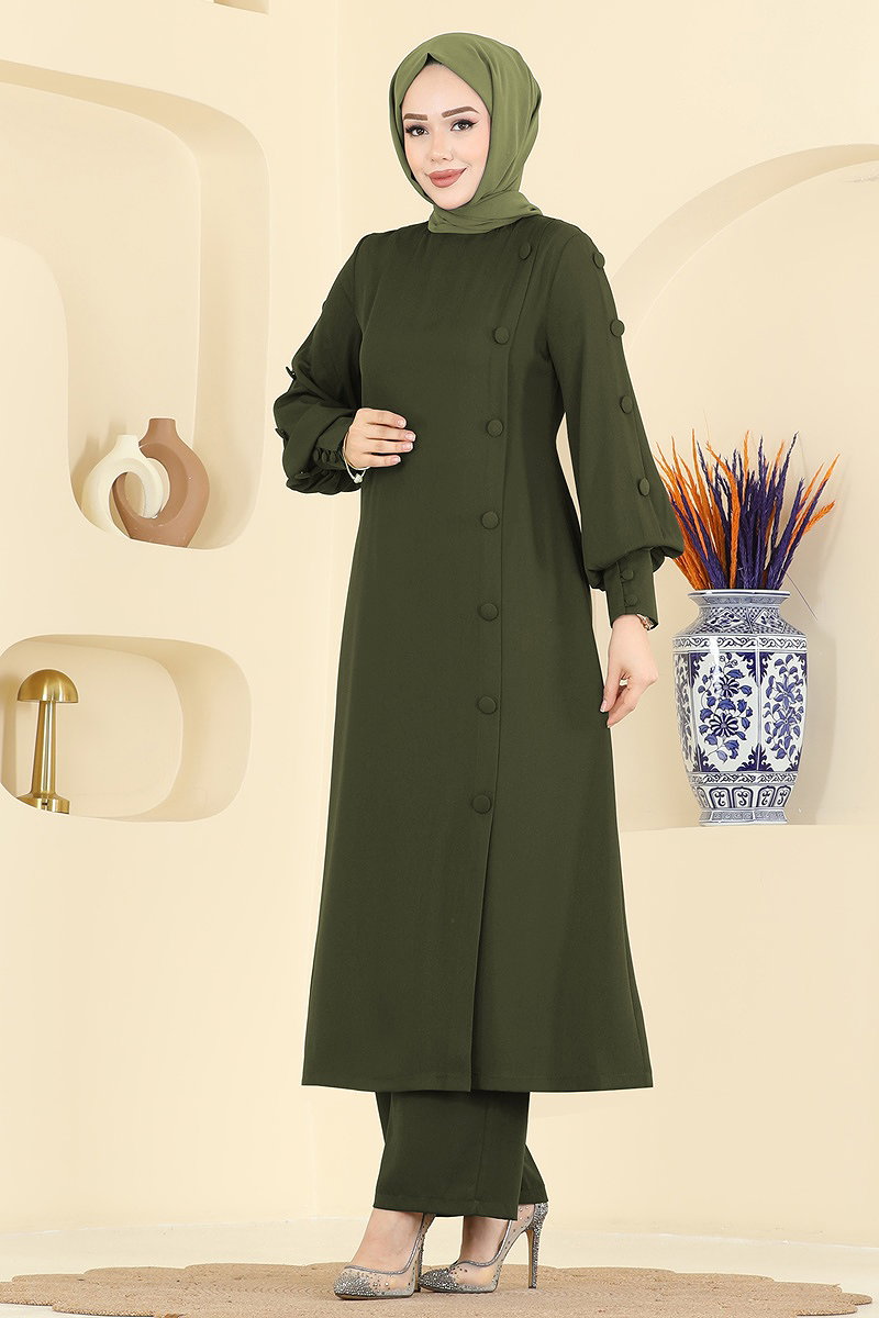 The Accessorized Buttoned Imported Crepe Suit COMBINE is a modest wear product suitable for all seasons. It can be washed at 30 degrees with gentle care, made from high-quality imported crepe fabric. The bicycle neck design offers a modern look while its unlined structure provides light and comfortable wear. The back zipper detail ensures practical use, and the added buttons as accessories enhance its elegance. With an elastic waistband and active cuff buttons, it offers both comfort and functionality. The model's height is 165 cm, with measurements of chest 88 cm, waist 68 cm, hips 99 cm, and weight 56 kg. This chic combination of tunic and trousers will become an essential part of your wardrobe.