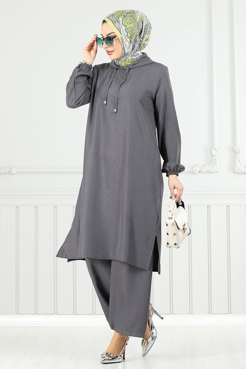 Product Feature : It is a new season hijab fashion product. The product has a Hooded collar. The tunic has a side slash.. Unlined. The hood is sewn to the product. The waist of the trousers is elastic. The cuff is rubberized. There may be a tonal difference in the product due to concept photo shoots.