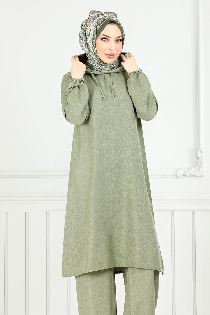 Product Name: Hooded Linen Suit COMBINATION; This chic and comfortable hijab suit is suitable for use throughout the four seasons. Cleaned at 30 degrees with delicate wash, this suit is made from high-quality linen fabric. The tunic, featuring hood and elasticated cuffs, offers freedom of movement with its side slits. The elastic waistband of the pants provides a comfortable fit. Whether for everyday wear or special occasions, it offers both comfort and elegance.
