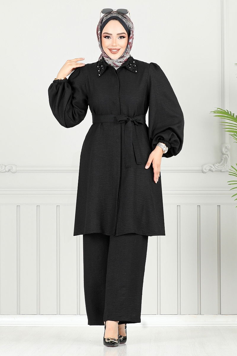 Product Feature : It is a new season hijab fashion product. The product has a Shirt collar. The product has Secret buttons. Unlined. Stone details are erected. The waist of the trousers is elastic. The cuff is rubberized. There may be a tonal difference in the product due to concept photo shoots.