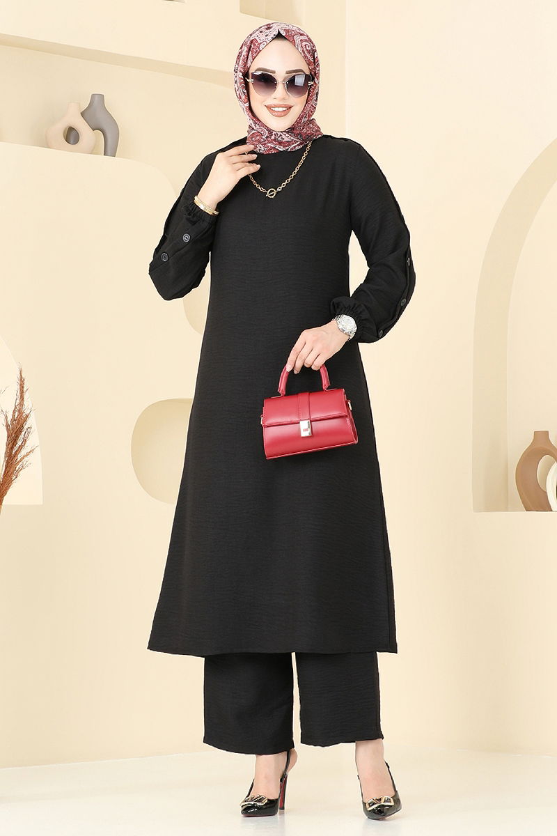 The Epaulet Detail Linen Suit is an ideal choice for sophisticated and modern modest fashion. Suitable for all seasons, this suit offers both comfort and style with its Sofia linen fabric. It is washable at 30 degrees on a gentle cycle, unlined, and features a back zipper for ease of use. The crew neck, button details, and elastic waistband on the trousers provide both comfort and an aesthetic look. The elastic cuffs on the tunic and trousers ensure freedom of movement. Key measurements of the model: height 165 cm, chest 88 cm, waist 68 cm, hips 99 cm, and weight 56 kg.