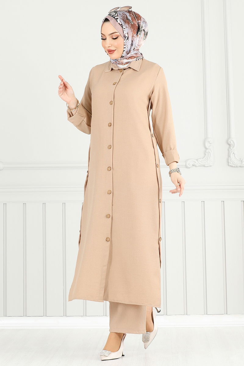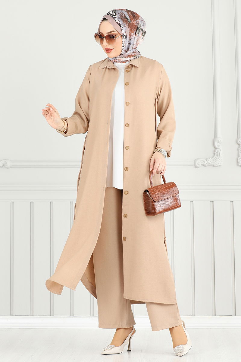 المنتج لديه ياقة القميص. المنتج به أزرار من الأمام. الازرار الموجود بالفتحات اكسسوار. غير مبطنة. البلوزة غير متضمنة. صُنعت عينة من المجموعة مع البلوزة لإظهار الاستخدام المقصود للمنتج. خصر البنطال مرن. أزرار الكفة نشطة. قد يكون هناك اختلاف في الدرجة اللونية في المنتج بسبب التقاط الصور الفوتوغرافية.
