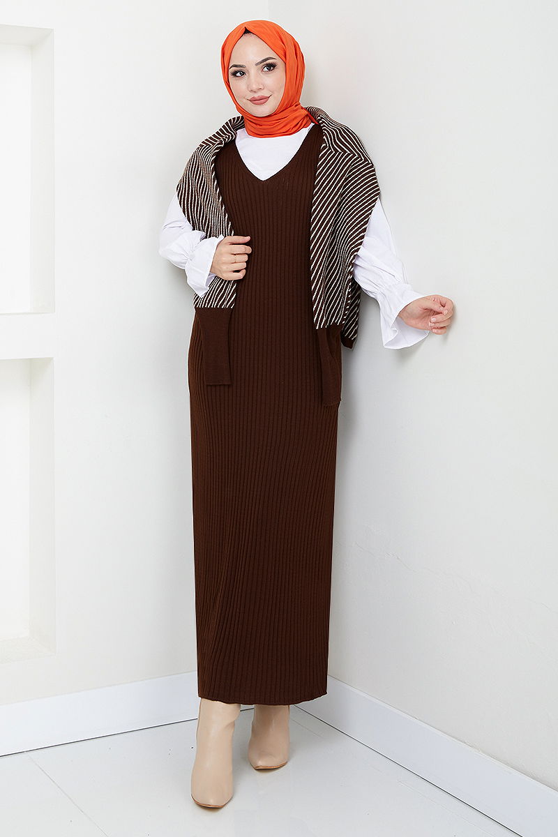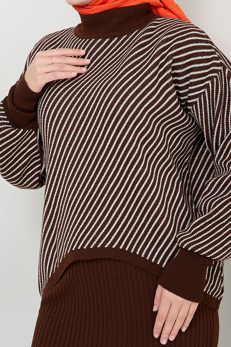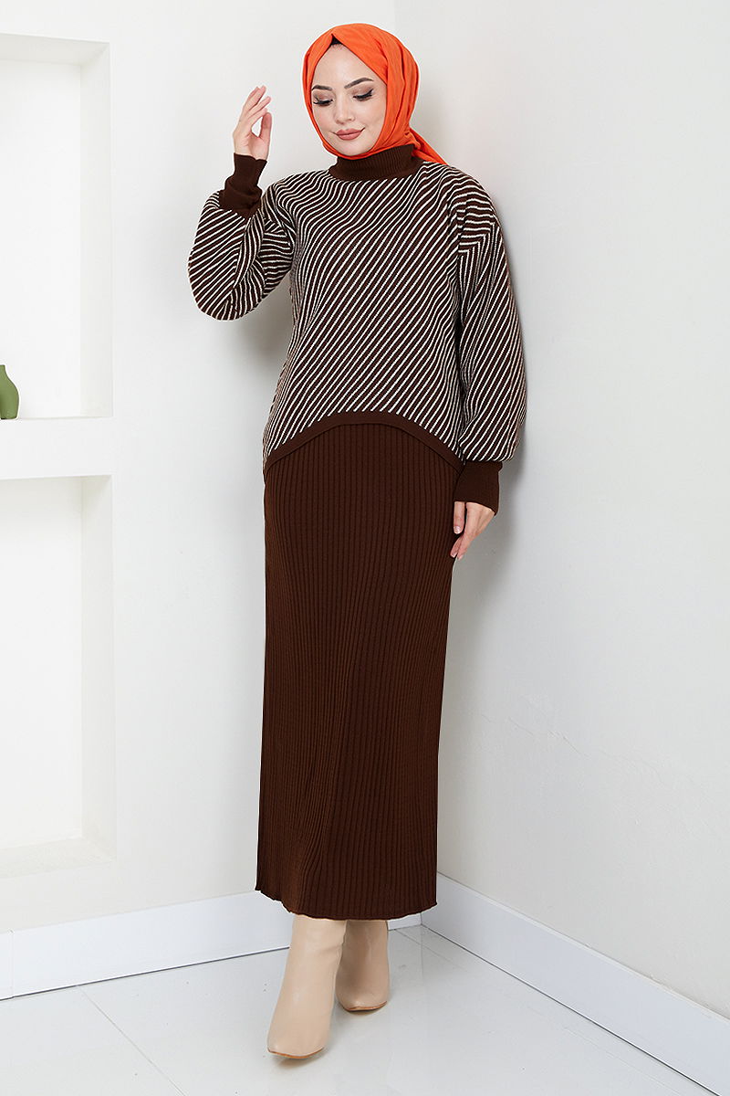 Striped Knit Set KOMBİN model is a modest fashion product. It can be worn in Autumn and Winter seasons. It should be washed at 30 degrees without squeezing. Made of first-class knit fabric. The product has a Half High Neck. Unlined. The inner dress is worn from the head. BLUZ and Dress
