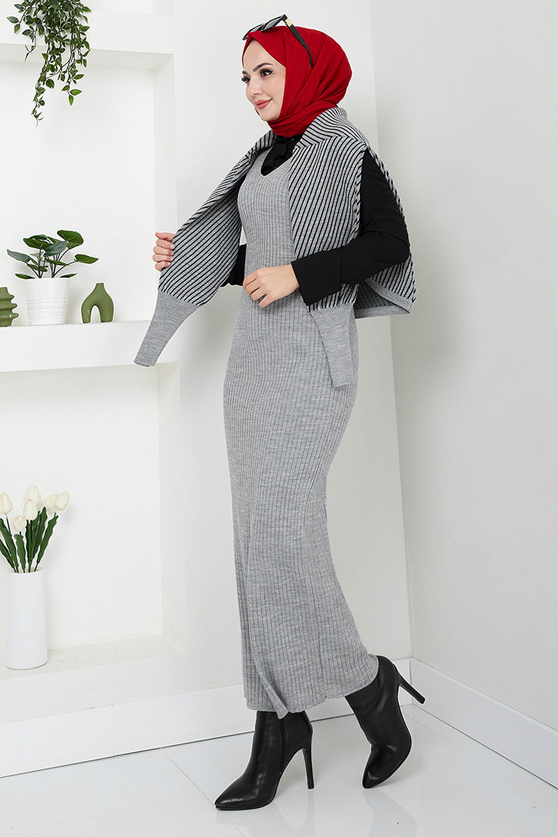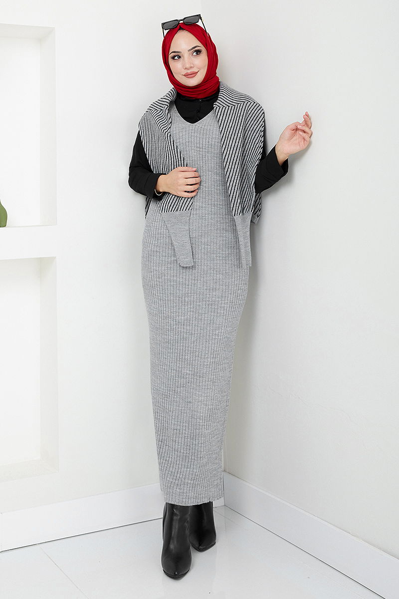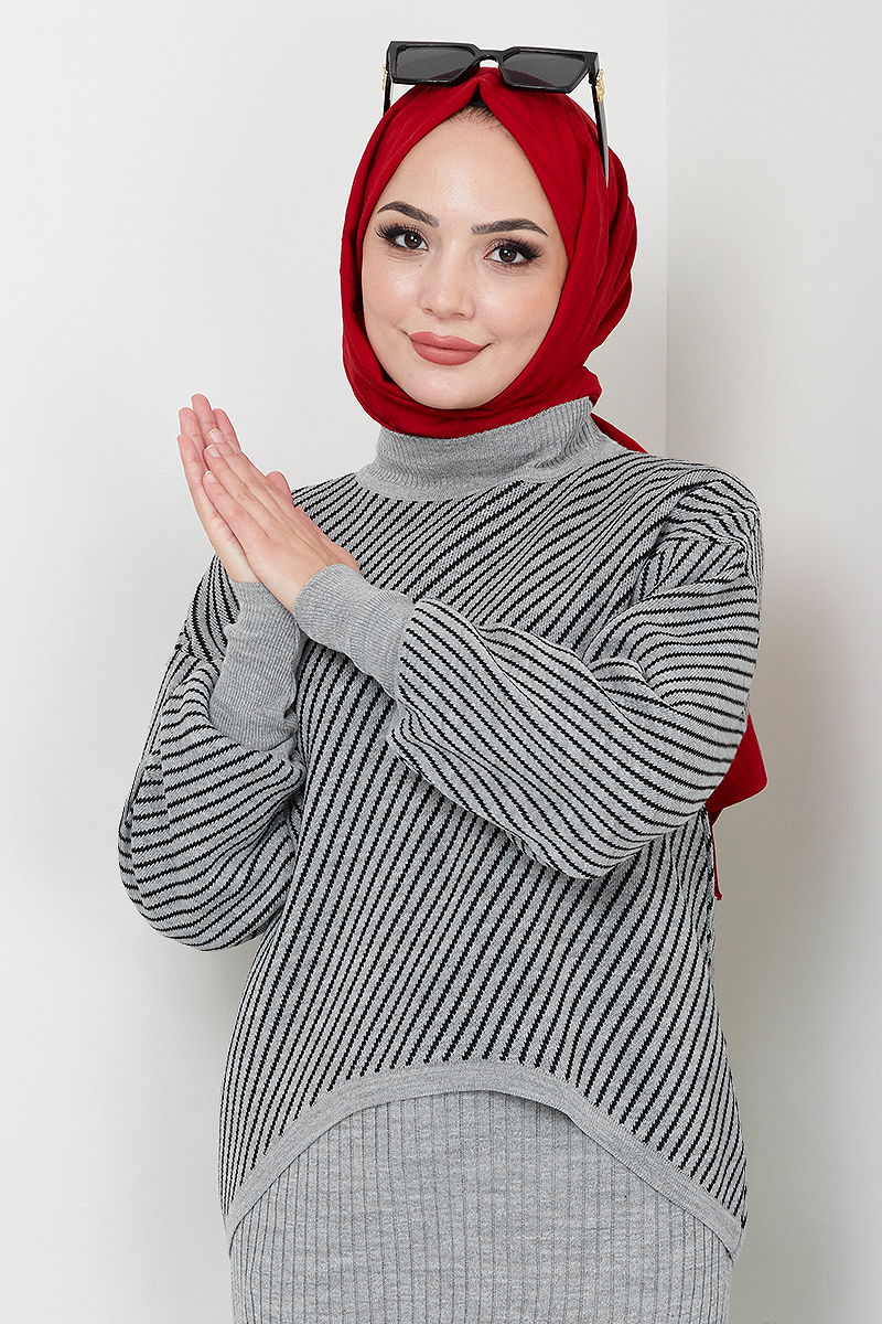 Striped Knit Set KOMBİN model is a modest fashion product. It can be worn in Autumn and Winter seasons. It should be washed at 30 degrees without squeezing. Made of first-class knit fabric. The product has a Half High Neck. Unlined. The inner dress is worn from the head. BLUZ and Dress