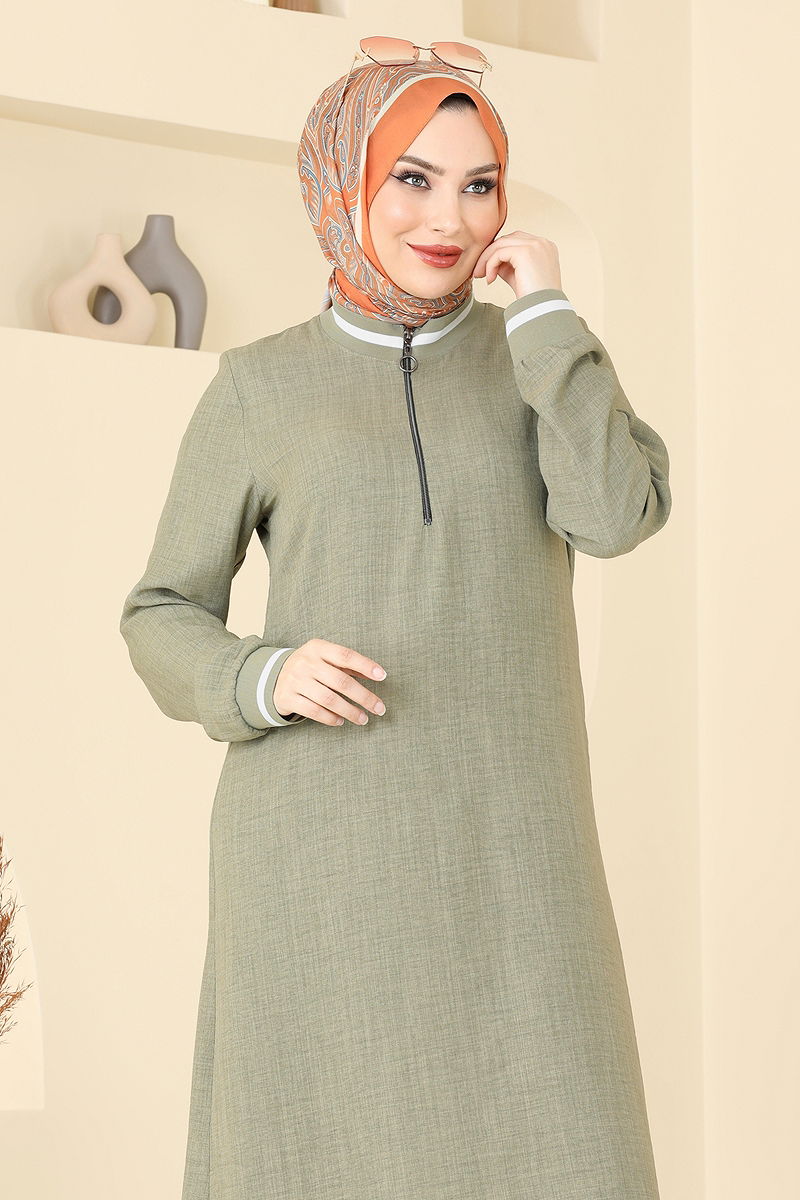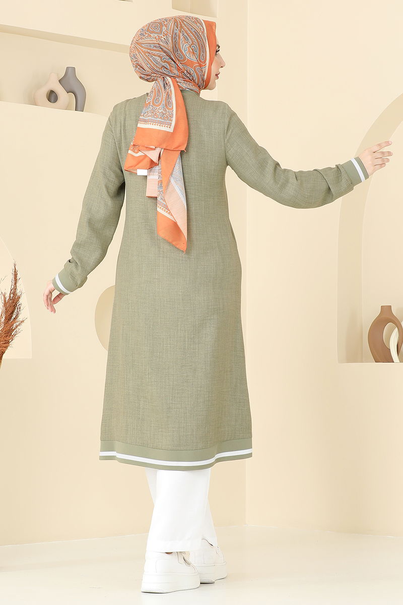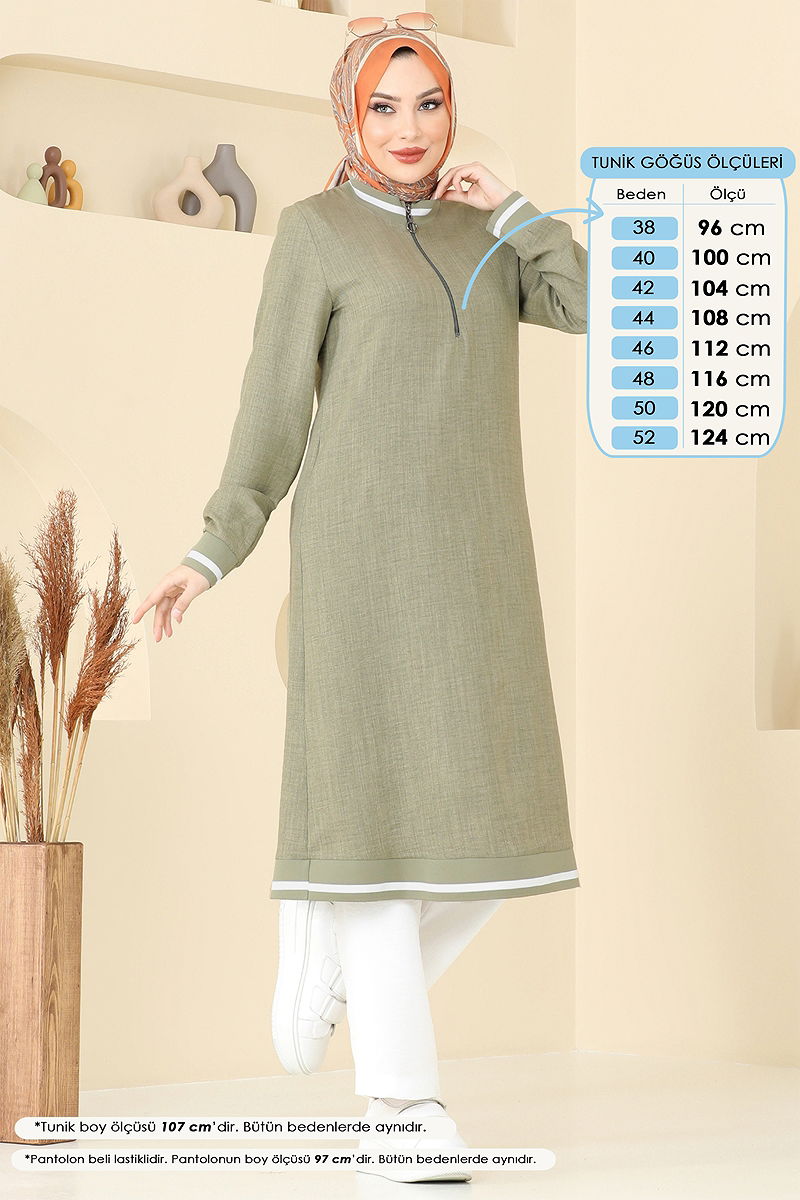 The Half-Zip Linen Suit is a distinguished hijab fashion piece designed for all-season wear. Made from delicate Sofia linen fabric, it offers a comfortable fit. This garment is machine washable at 30 degrees on a gentle cycle, ensuring its durability. Featuring a crew neck and unlined design, it provides a contemporary look while the elastic waist on the pants ensures a fit for all sizes. Comprising a tunic and pants, this set is perfect for those seeking both elegance and comfort in their attire.