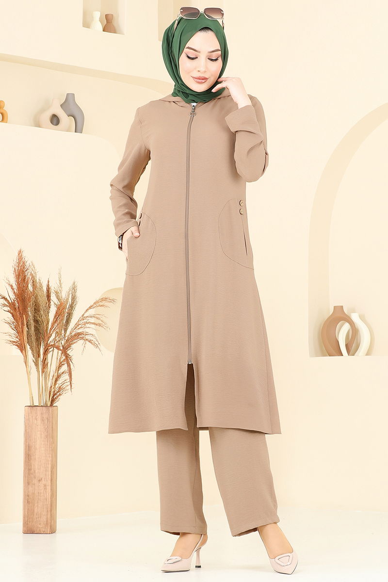 Product Feature : It is a new season hijab fashion product. The product has a Hooded collar. Unlined. The product has a zipper at the From the front part. The hood is sewn to the product. Buttons are accessories. Blouse is not included. Sample combination is made with the blouse to show the intended use of the product. Pocket available. The waist of the trousers is elastic. There may be a tonal difference in the product due to concept photo shoots.