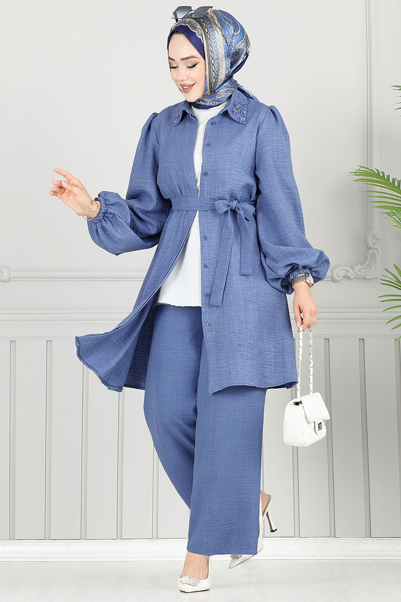 The Jewel Neckline Hijab Suit is a sophisticated and comfortable model product. It can be used comfortably throughout the four seasons. This product is machine washable at 30 degrees on a gentle cycle. Made of Sofia Linen fabric, it offers durable use. Featuring a shirt collar design and hidden buttons, it provides lightweight and comfortable wear without any lining. The jewel details are carefully sewn. The included belt is designed with sewn ends and an unstitched middle part to prevent waviness; it can be optionally removed. The waist of the pants is elasticated, and both the tunic and pants cuffs are elasticated, offering a flexible fit.