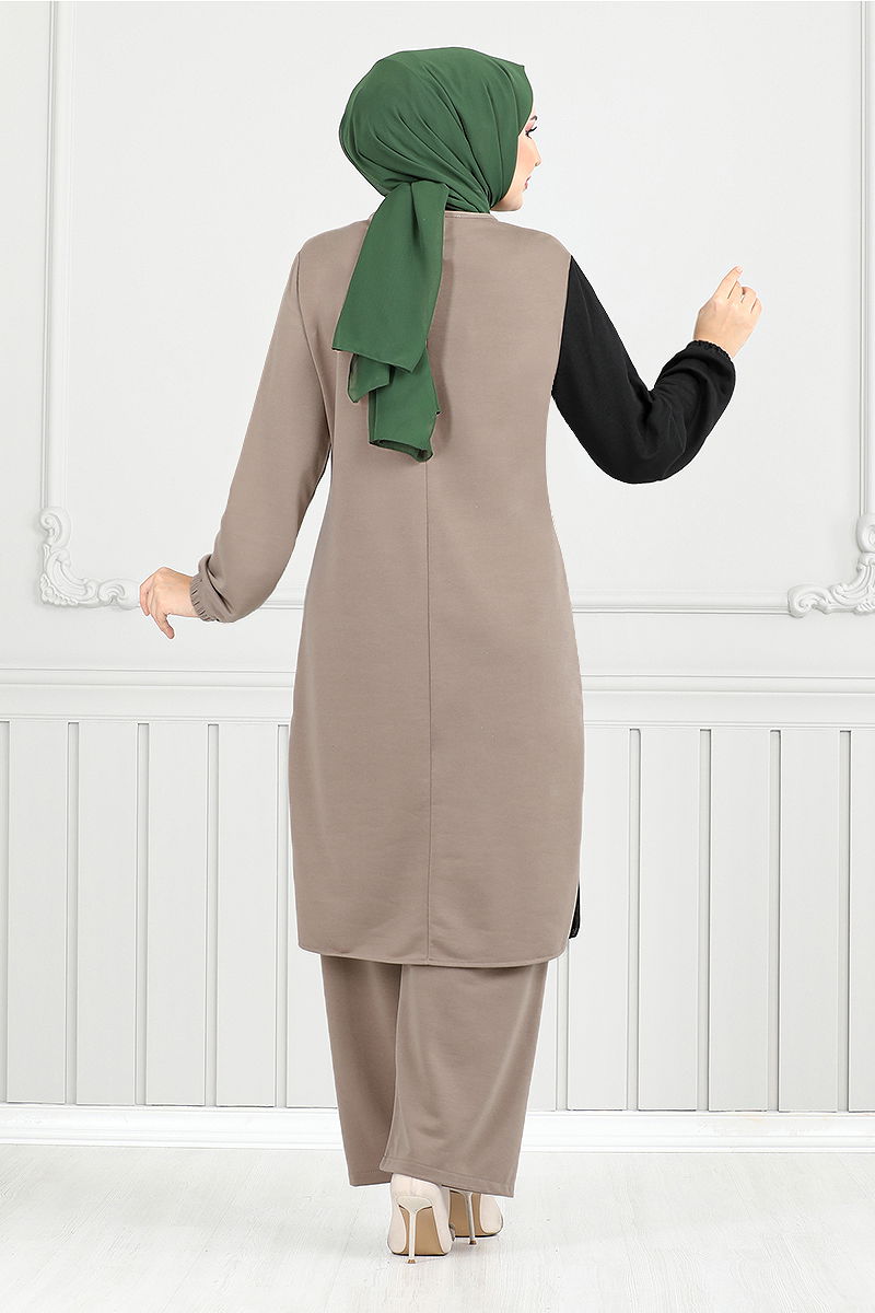 يوجد زر يمكن استخدامه من الخلف. المنتج لديه ياقة دائرية. البلوز تحتوي على فتحة. غير مبطنة. يتم لصق الحجارة. خصر البنطال مرن. السوار مطاطي. قد يكون هناك اختلاف في الدرجة اللونية في المنتج بسبب التقاط الصور الفوتوغرافية.