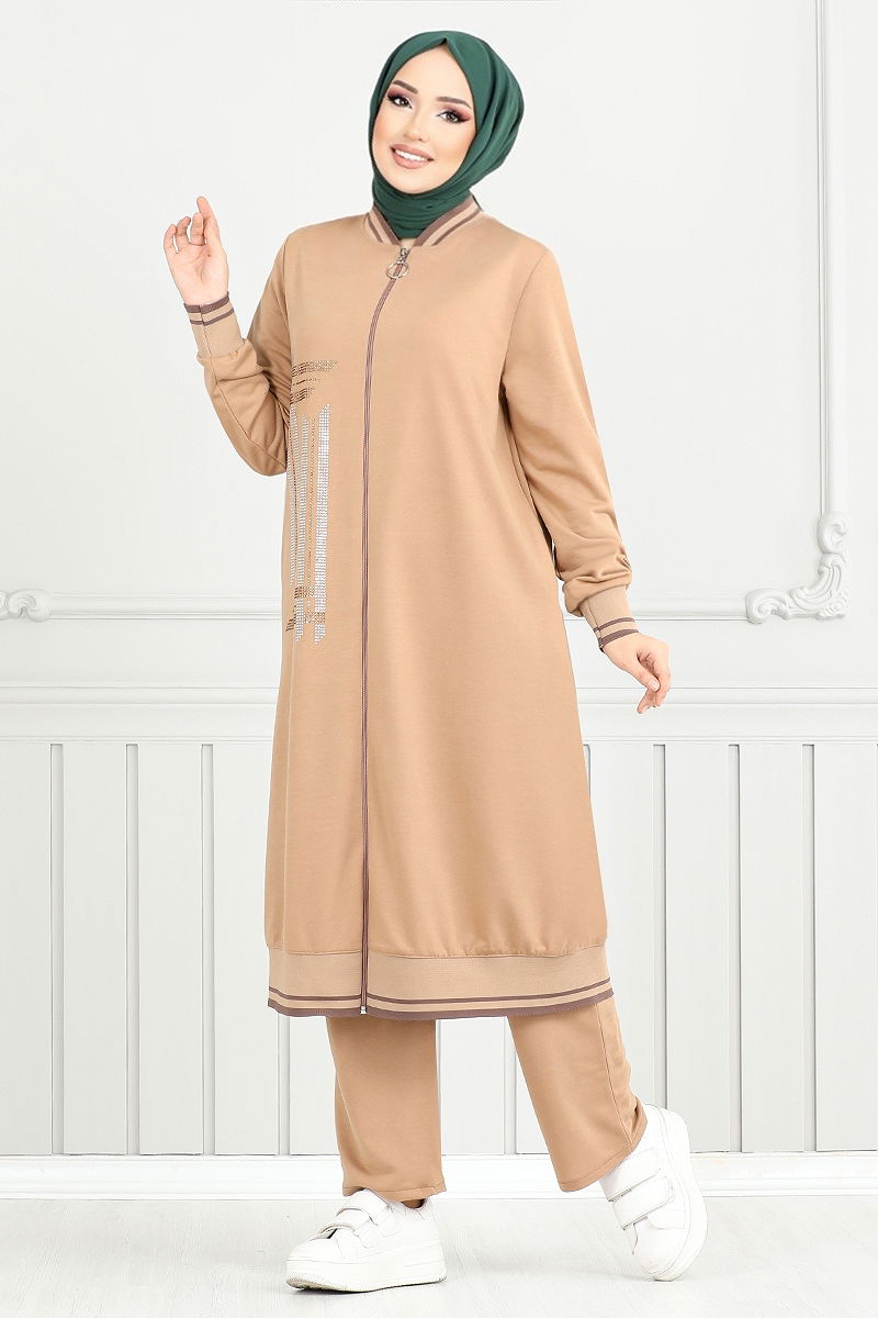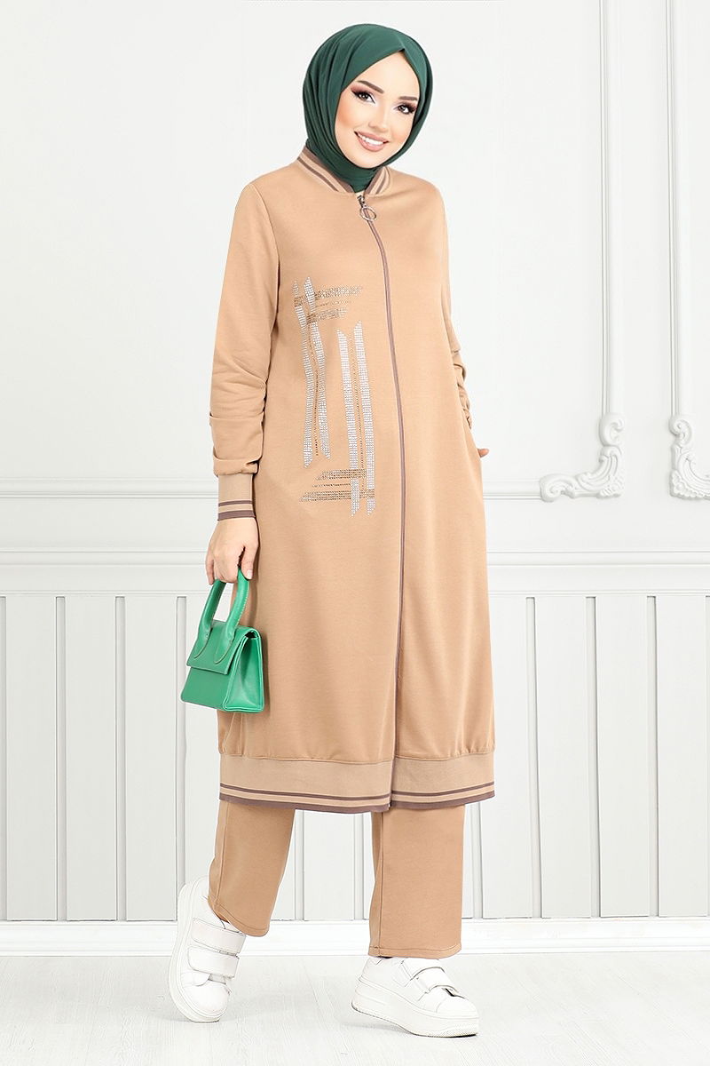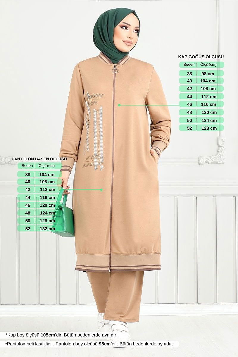 The Stone Detail Hijab Suit offers unique elegance, suitable for all seasons. Made from double-thread fabric, this special design can be washed at 30 degrees on a gentle cycle. Featuring a half stand-up collar and unlined structure, it prioritizes comfort. The stick-on stone details add a refined look, while the front zipper makes dressing easier. Its elastic waistband and pocketed trousers provide practicality. The product shown on the model is size 38.