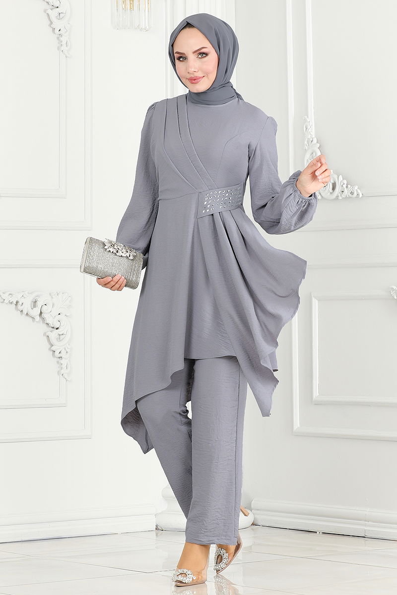 Product Feature : It is a new season hijab fashion product. The product has a Cycling collar. Unlined.. The product has a zipper at the from the back part. The stones are glued. The waist of the trousers is elastic. The cuff is rubberized. There may be a tonal difference in the product due to concept photo shoots.