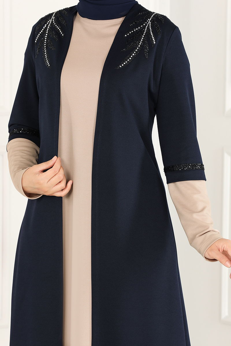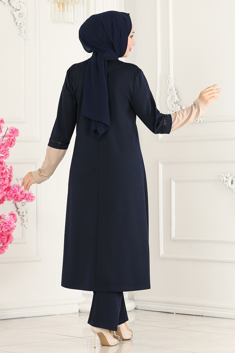 Product Feature:It is a new season hijab fashion product. (It is unlined.) It has a bicycle collar. There is a button that can be used from the back. The stones are glued. The trouser waist is elastic. The inner tunic is sewn to the product. There may be a tonal difference in the product color due to concept shots.