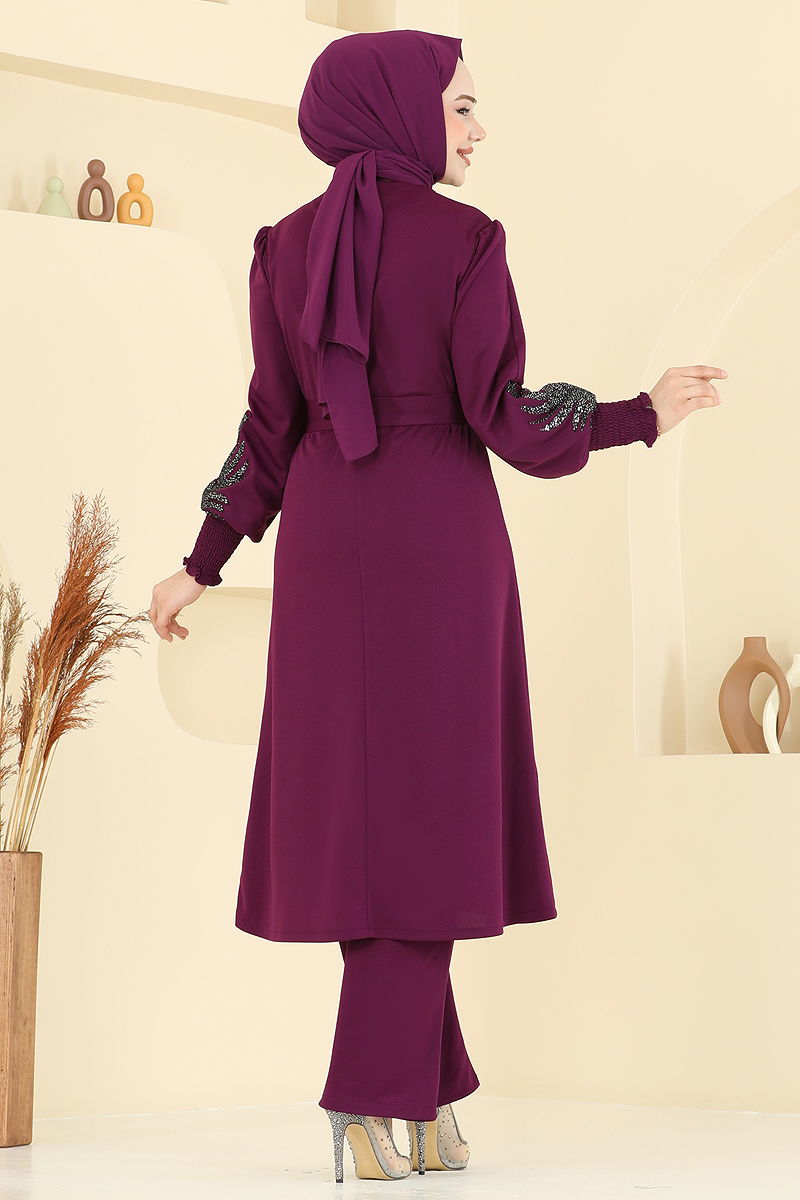 Product Feature : It is a new season hijab fashion product. It has a button that can be used from the back. The product has a Cycling collar. Unlined. Sequin sequin detail is sewn. Cardigan is sewn to the product. Belt included, optional not available. The waist of the trousers is elastic. There may be a tonal difference in the product due to concept photo shoots.