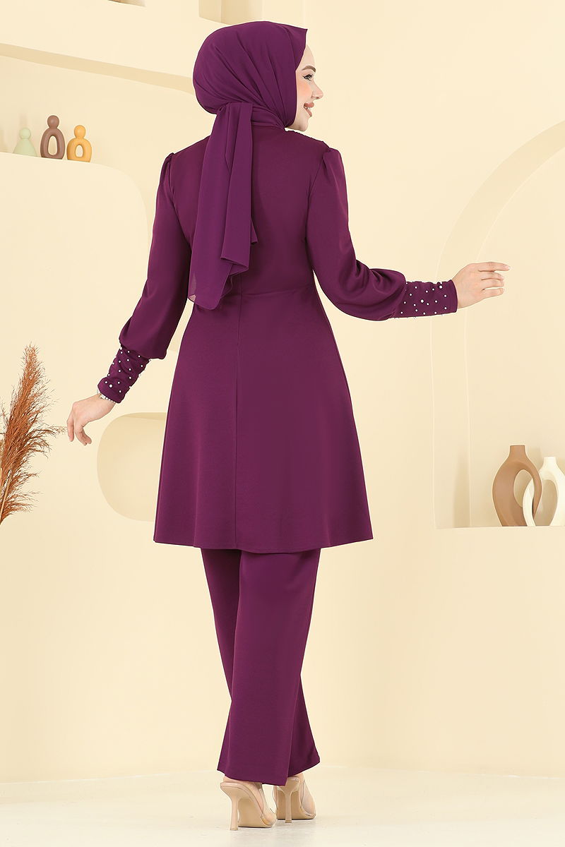 Chic and modern, the Pearl Detail Two-Piece Set merges elegance and comfort in modest wear. Suitable for all seasons, this product can be washed gently at 30 degrees. Made from knitted Dabil fabric, this set features a crew neck and is unlined. The back has a zipper, and the pearl details provide a stunning appearance. The elastic waistband on both the tunic and pants ensures comfortable wear.