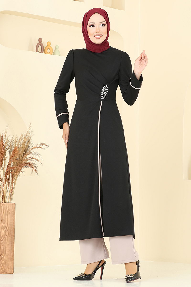 المنتج لديه ياقة دائرية. البلوز تحتوي على فتحة. غير مبطنة. المنتج به سحاب في جزء من الخلف. يتم لصق الحجارة. خصر البنطال مرن. قد يكون هناك اختلاف في الدرجة اللونية في المنتج بسبب التقاط الصور الفوتوغرافية.