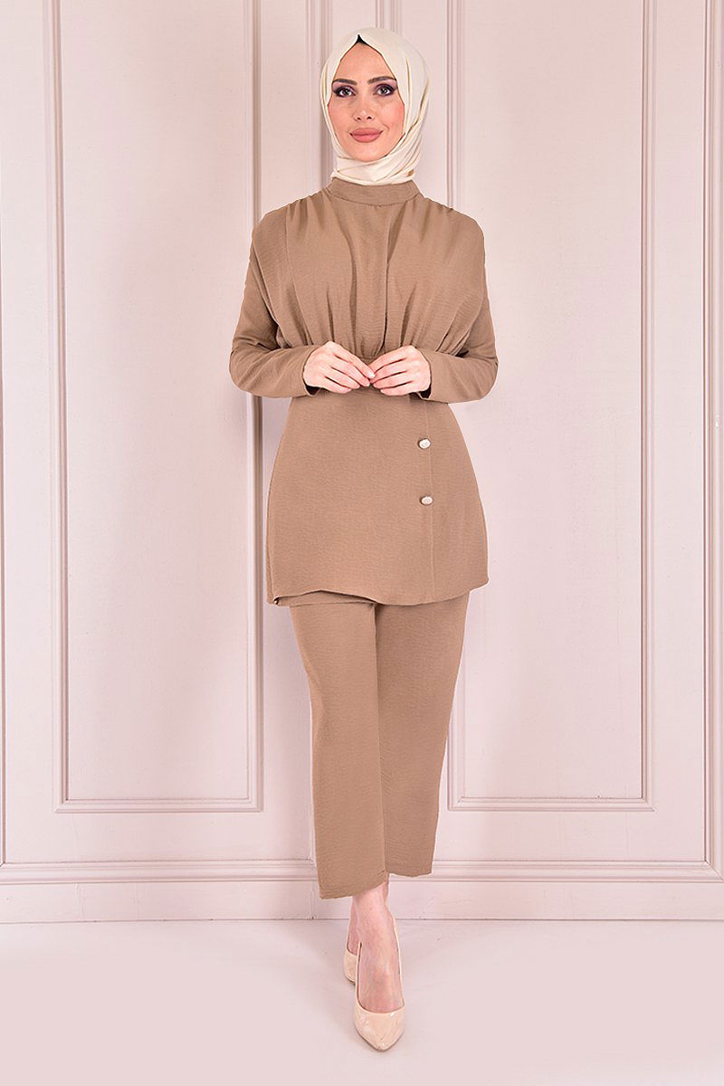 Half-Buttoned Two-Piece Suit KOMBİN model hijab product. It can be used in Spring and Summer seasons. It should be washed at 30 degrees without squeezing. It is made of first-class Linen Aerobin fabric. The product has a Bicycle collar. The product is buttoned from the front. It is unlined. The product has a back zip. (The product on the model is size 38.) It has a usable zipper at the back. The buttons are accessories. The waist of the pants is elastic. Tunic and TROUSER