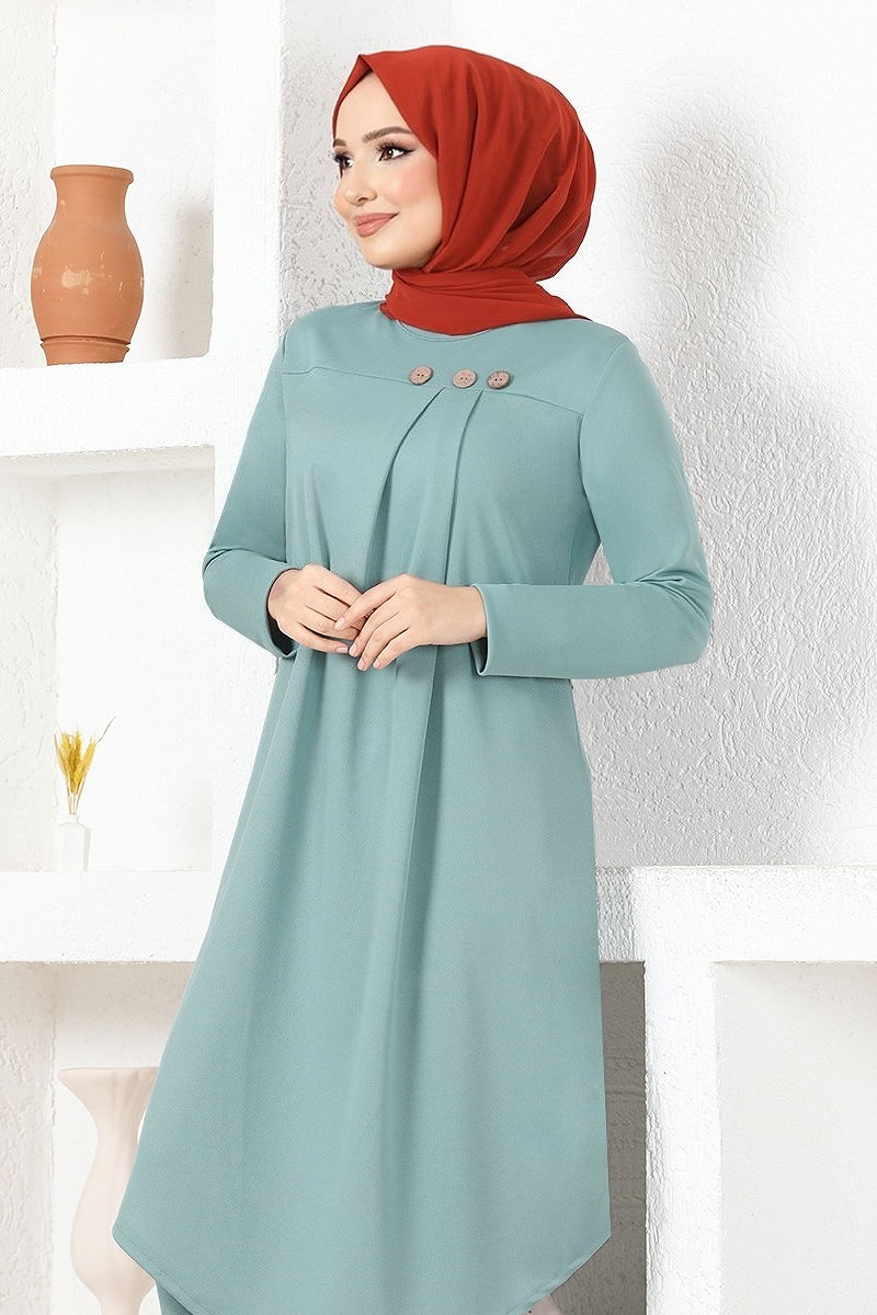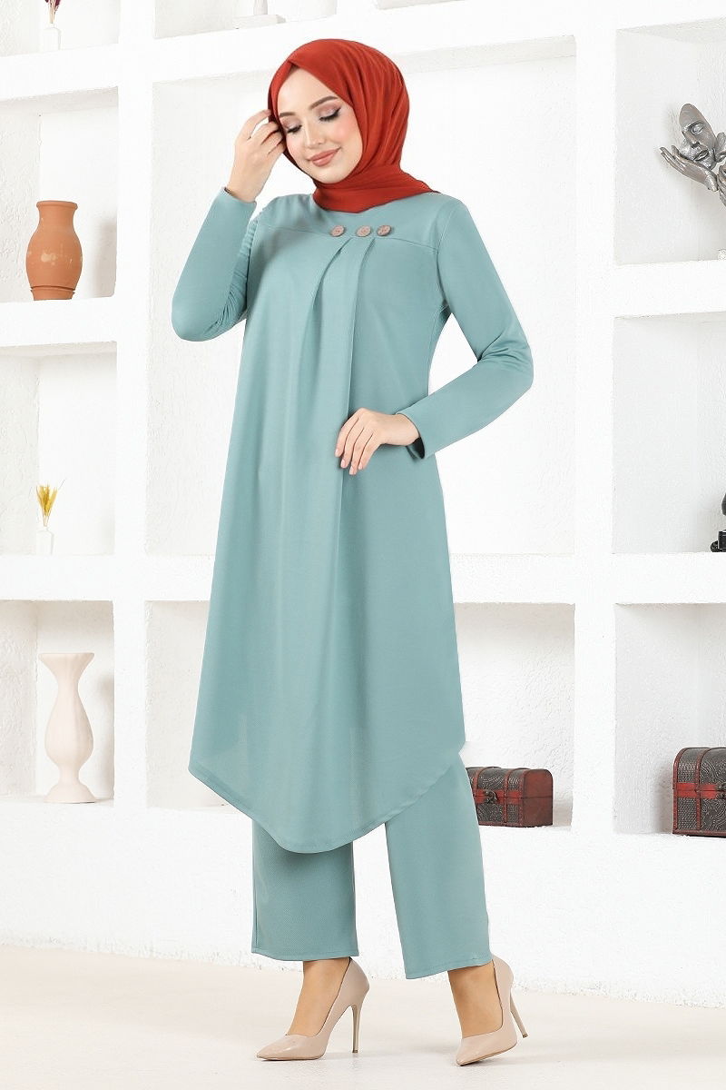 Product Feature:It is a new season hijab fashion product. (It is unlined.) It is a bicycle collar. The product is worn from the head. Buttons are accessories. The trouser waist is elastic. There may be a tonal difference in the product color due to concept shots.