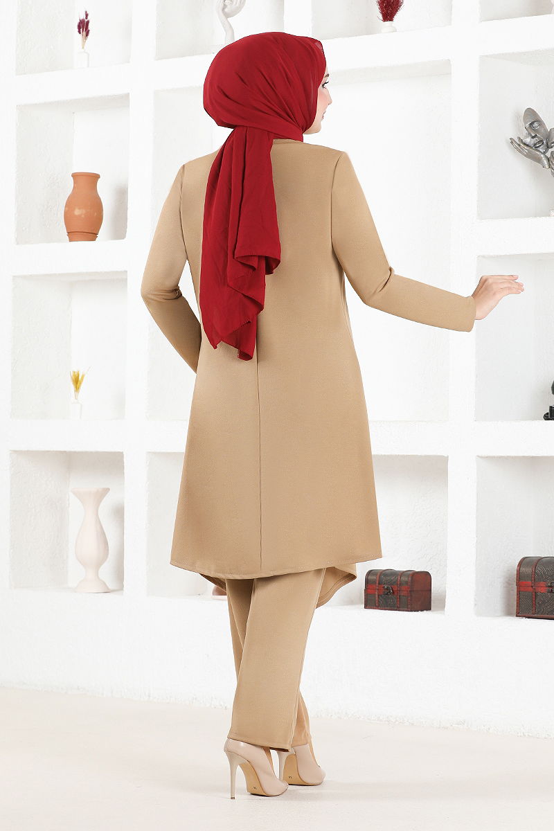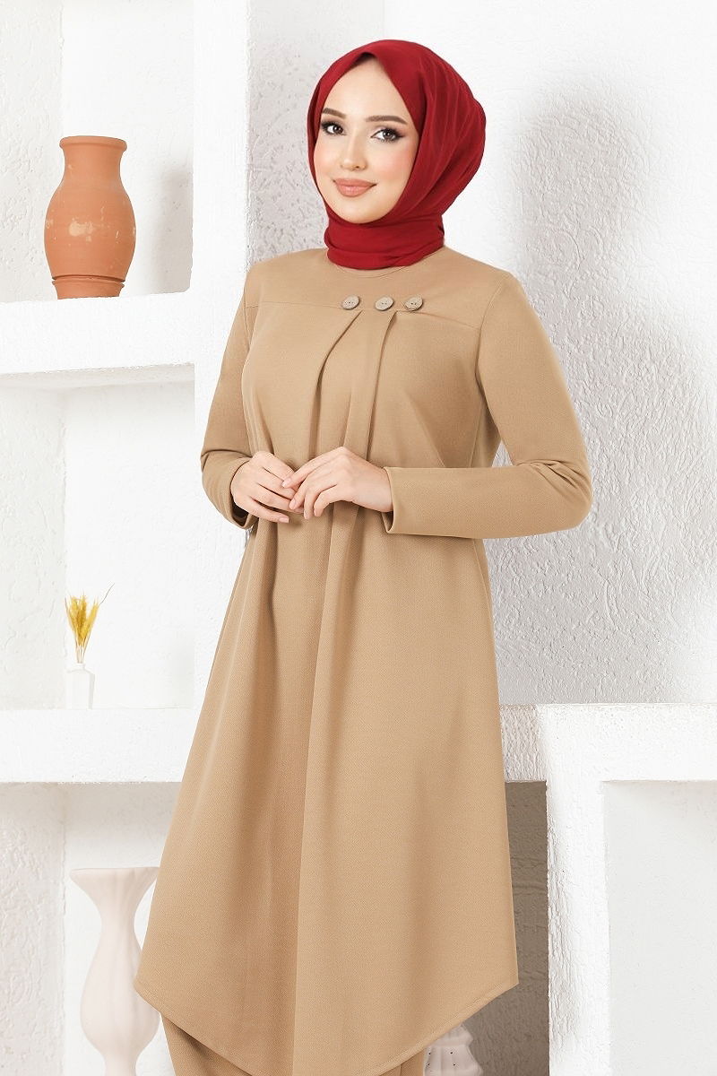 Product Feature:It is a new season hijab fashion product. (It is unlined.) It is a bicycle collar. The product is worn from the head. Buttons are accessories. The trouser waist is elastic. There may be a tonal difference in the product color due to concept shots.