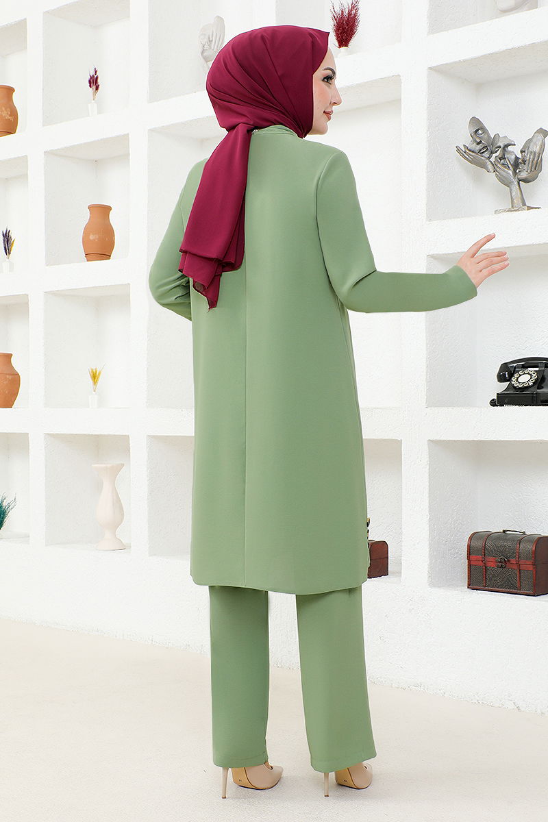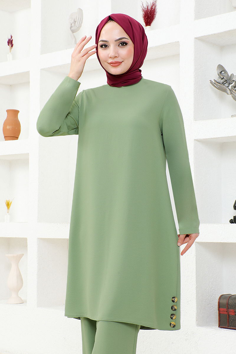 Product Feature:It is a new season hijab fashion product. (It is unlined.) It is a bicycle collar. The product is worn from the head. Buttons are accessories. The trouser waist is elastic. There may be a tonal difference in the product color due to concept shots.