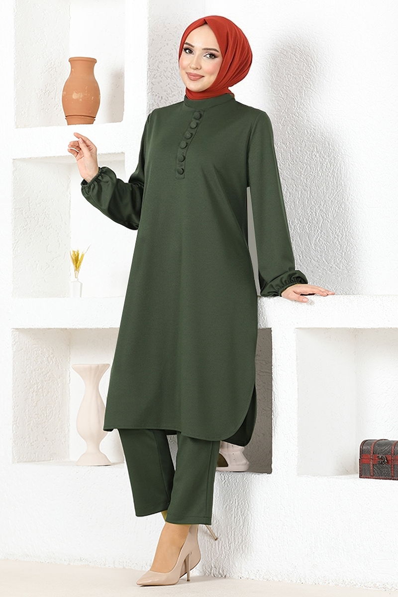 Accessory Buttoned Mira Team COMBIN model hijab product is an option suitable for use in four seasons. It is recommended to wash at 30 degrees without spinning. Made of first class Mira fabric, the product has a bicycle collar and is unlined. The pants have an elastic waist. The size options of the product, which is offered as a tunic and trousers together, are between 38-50 and color options are available in beige, burgundy, khaki, lilac, black, tan, stone, emerald and indigo. The product on the model is size 38.| Size | Chest | Length |