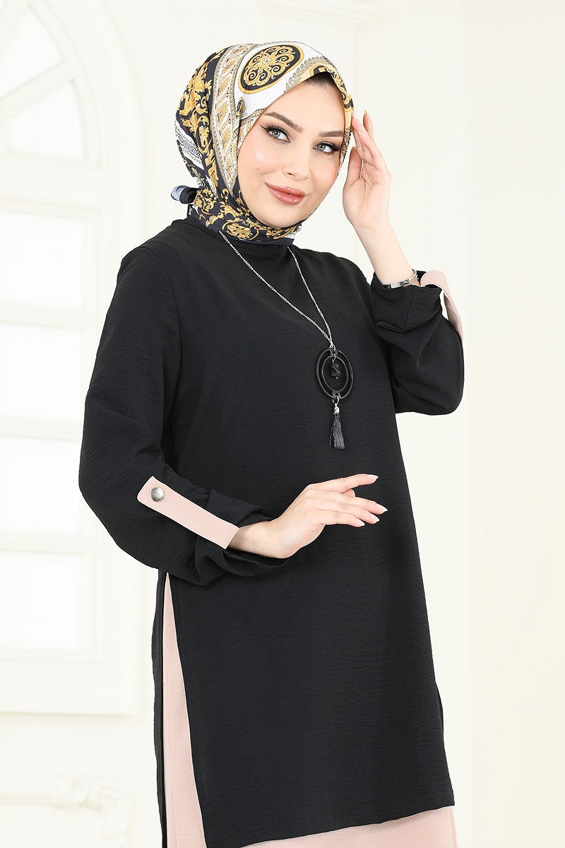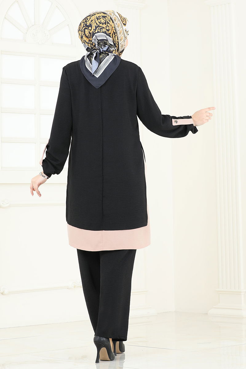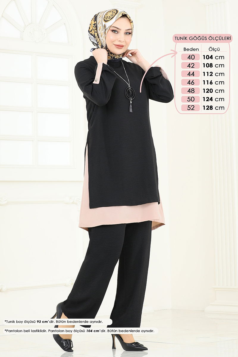 يوجد زر يمكن استخدامه من الخلف. المنتج لديه ياقة دائرية. تم خياطة البلوز الداخيلة القلادة متضمنة واختيارية يمكن استخدامها حسب الرغبة خصر البنطال مرن. أزرار الكفة نشطة. قد يكون هناك اختلاف في الدرجة اللونية في المنتج بسبب التقاط الصور الفوتوغرافية.