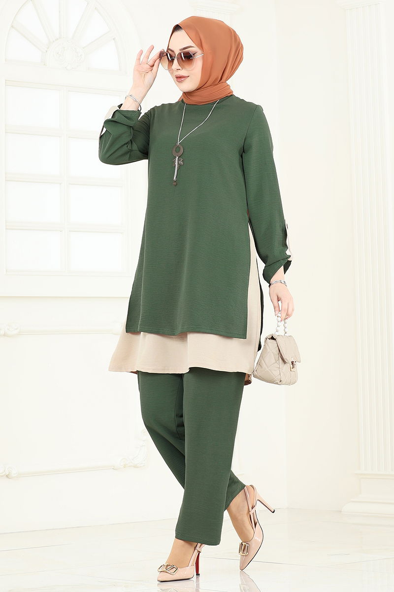 يوجد زر يمكن استخدامه من الخلف. المنتج لديه ياقة دائرية. تم خياطة البلوز الداخيلة القلادة متضمنة واختيارية يمكن استخدامها حسب الرغبة خصر البنطال مرن. أزرار الكفة نشطة. قد يكون هناك اختلاف في الدرجة اللونية في المنتج بسبب التقاط الصور الفوتوغرافية.